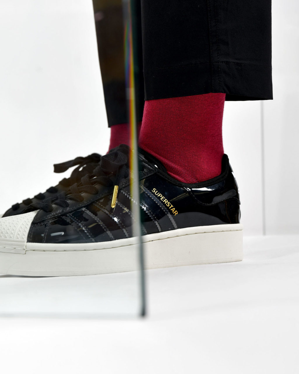 L’ADN du modèle d’origine est conservé tout en étant réinterprété de façon moderne. Les clichés présentent une sneaker en version Platform, avec une semelle compensée qui intègre toujours sur la toebox le fameux shell-toe. Autre originalité : l’utilisation d’une tige basse proposée dans une conception en TPU complètement transparente. Elle remplace le cuir habituellement utilisé sur cette sneaker depuis ses débuts, et offre ainsi une sneaker originale et un poids plume sur la balance. Le matériau très brillant offre ainsi un côté feutré à la sneaker tout comme l’inscription Superstar en lettrage doré. Les deux coloris présentés sont Core Black/Off White, une empeigne principalement noire avec une semelle et d’autres éléments blancs. Le second colorway Cloud White/Core Black est dominé par la transparence de la tige, une semelle blanche ainsi qu’une touche noire au talon. L’ajout de semelles de propreté noires sur les deux modèles offre un contraste intéressant grâce à la transparence de la tige.