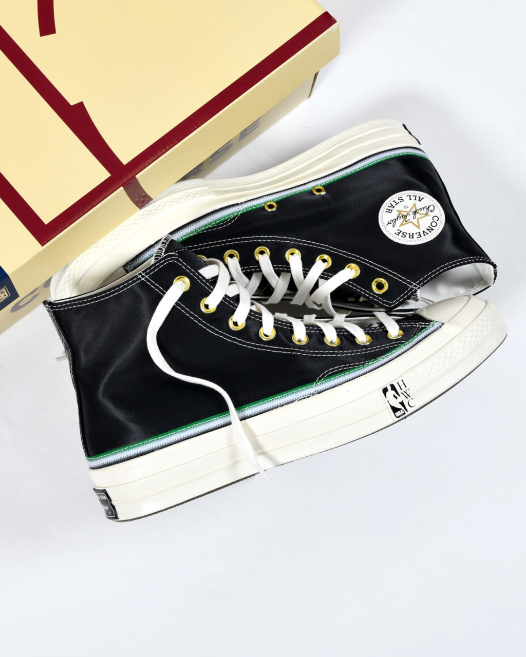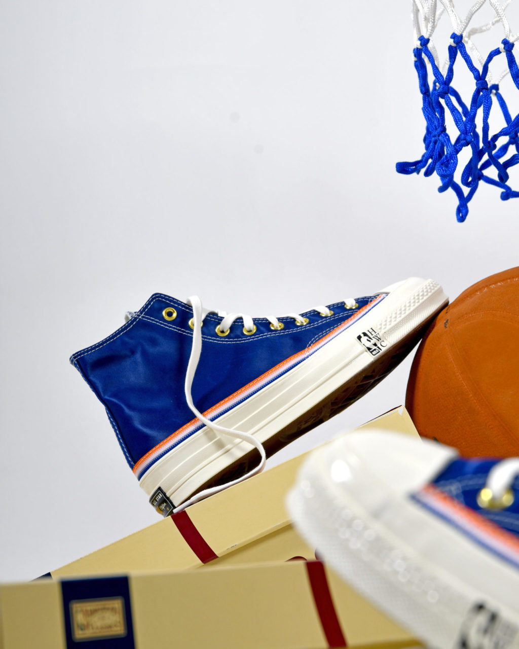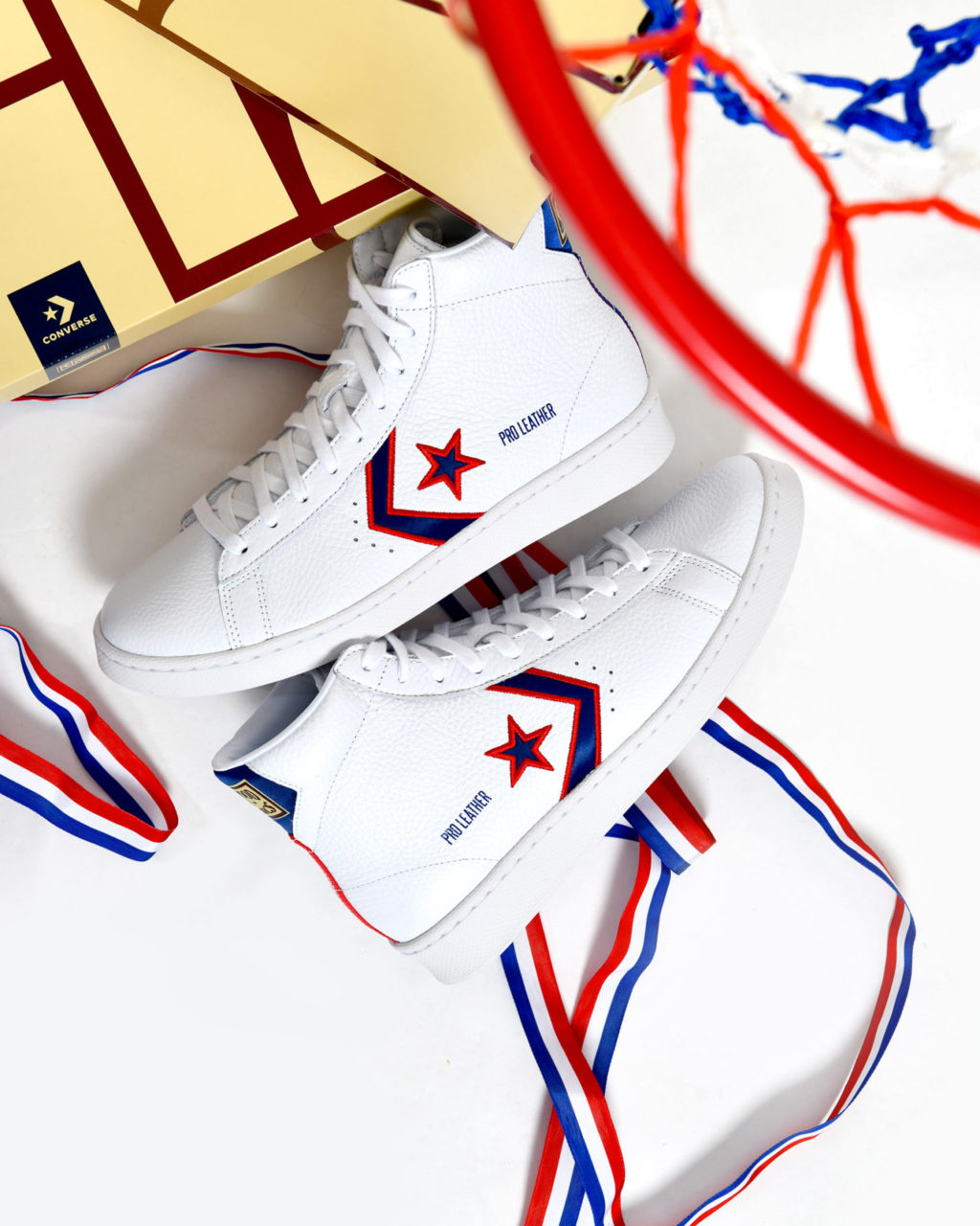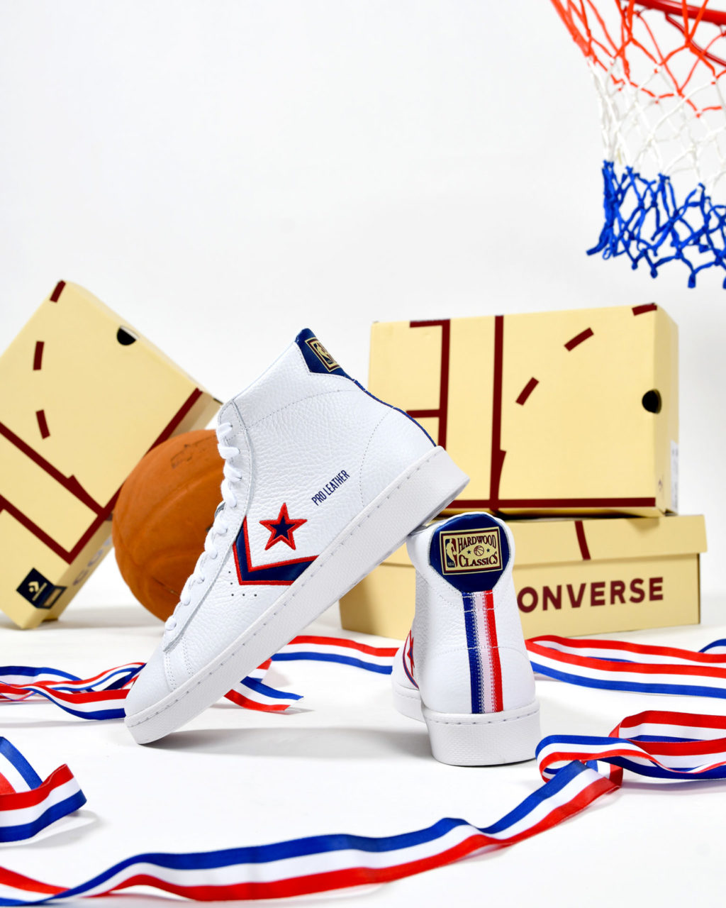 Les deux versions en toile de la Chuck 70 font hommage respectivement aux Washington Capitols et aux New-York Knicks. Les paires sont présentées dans des codes couleur noir et bleu complétés par de nombreux détails en lien avec les équipes NBA. On retrouve notamment le logo NBA Hardwood Classics sur la semelle intermédiaire ainsi que les noms, numéros et équipes respectives des joueurs au dos de chaque languette. La Pro Leather célèbre l’équipe des Pistons de Detroit car les trois joueurs ont évolué sous sa bannière durant leur carrière. La sneaker à tige haute est proposée dans un traitement en cuir blanc agrémenté de détails rouge et bleu en lien avec l’équipe du Michigan.