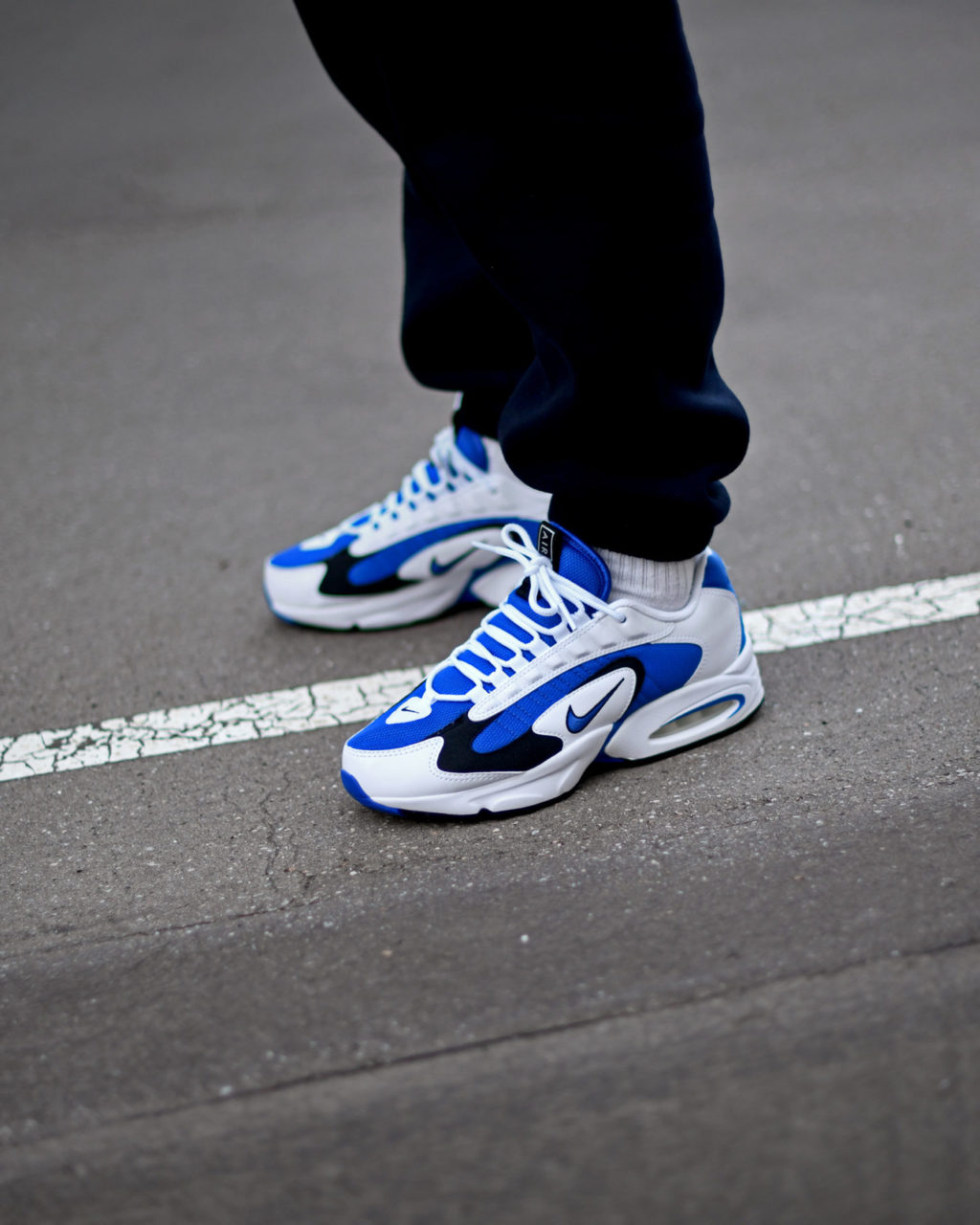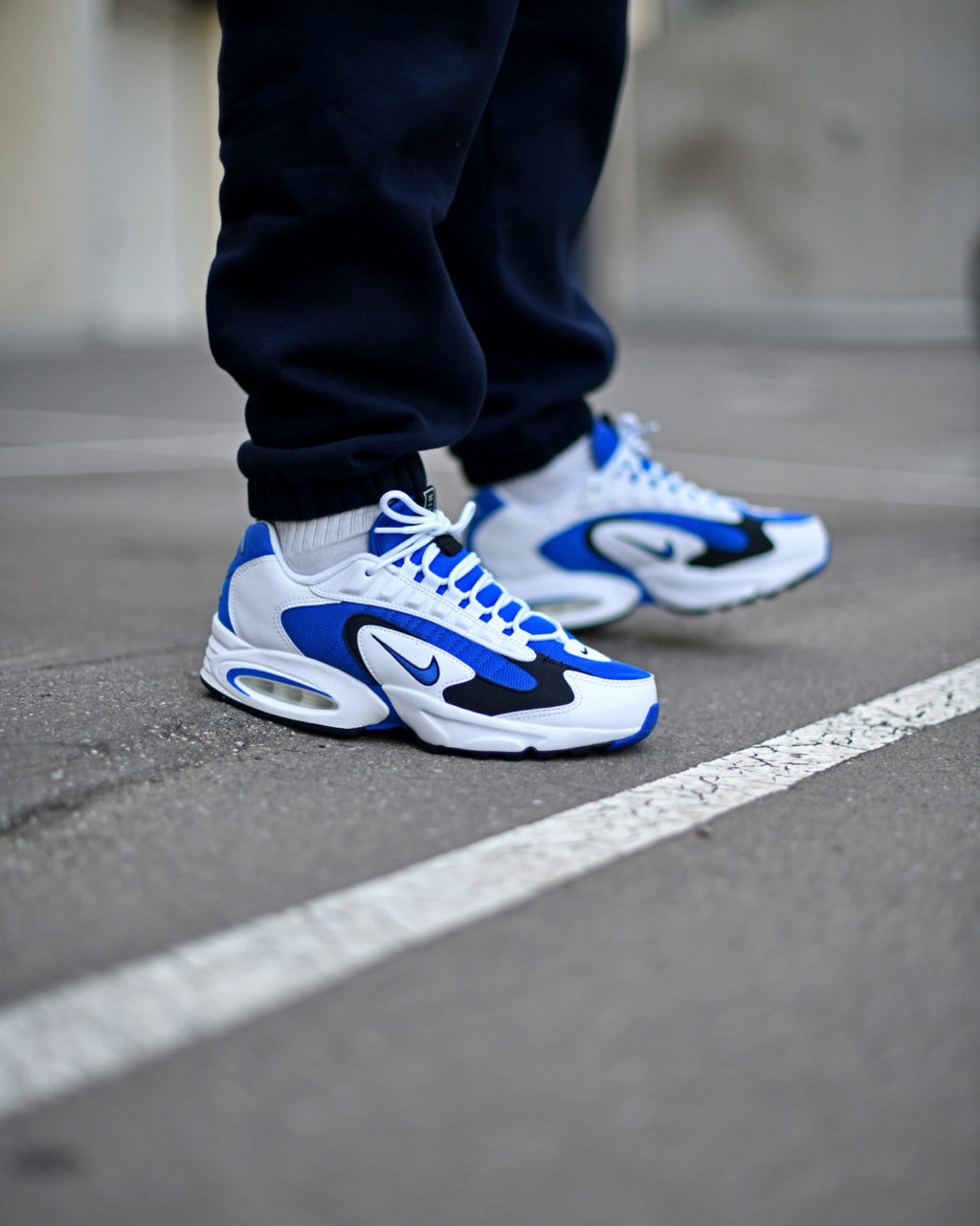 La grande sœur de la Nike Air Max 96, sortie la même année, pourrait donc logiquement suivre la destinée de la Nike Air Max² Light rééditée en 2019 et qui a conforté sa place en boutiques après une renaissance réussie. L’identité du modèle original est conservée pour cette réédition. Les sneakers sont présentées dans des coloris intéressants qui reposent chacun sur une base blanche. À cela, sont combinés des éléments bleus ou rouges selon le modèle, qui sont disposés autour de l’unité Air au talon, sur les passants de lacets ou encore sur la tige et le bout de la semelle. Destinées au running à l’époque, les paires reprennent la construction mêlant des empiècements en mesh, en cuir et en suède. Le Swoosh latéral brodé reprend le code couleur principal. Plusieurs éléments de type 3M sont appliqués au talon, sur la pièce suédée. Le logo Air Max Triax a été conservé et s’affiche sur les semelles de confort pour finaliser ce design.