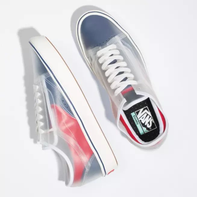 Les deux paires de Vans Slip-On, complètement repensées, sont, en effet, dotées d’un revêtement transparent qui recouvre l’intégralité de la tige. Plutôt que de laisser apparentes les entrailles de la sneaker, la marque a appliqué ses motifs et textures classiques sous cette couche transparente pour un effet inédit et très original. Il y a, d’un côté, un modèle Checkerboard blanc et noir qui reprend sur la toebox le fameux imprimé à damiers. La seconde version est une mouture en toile rouge, bleue et blanche, une teinte classique de la firme californienne.