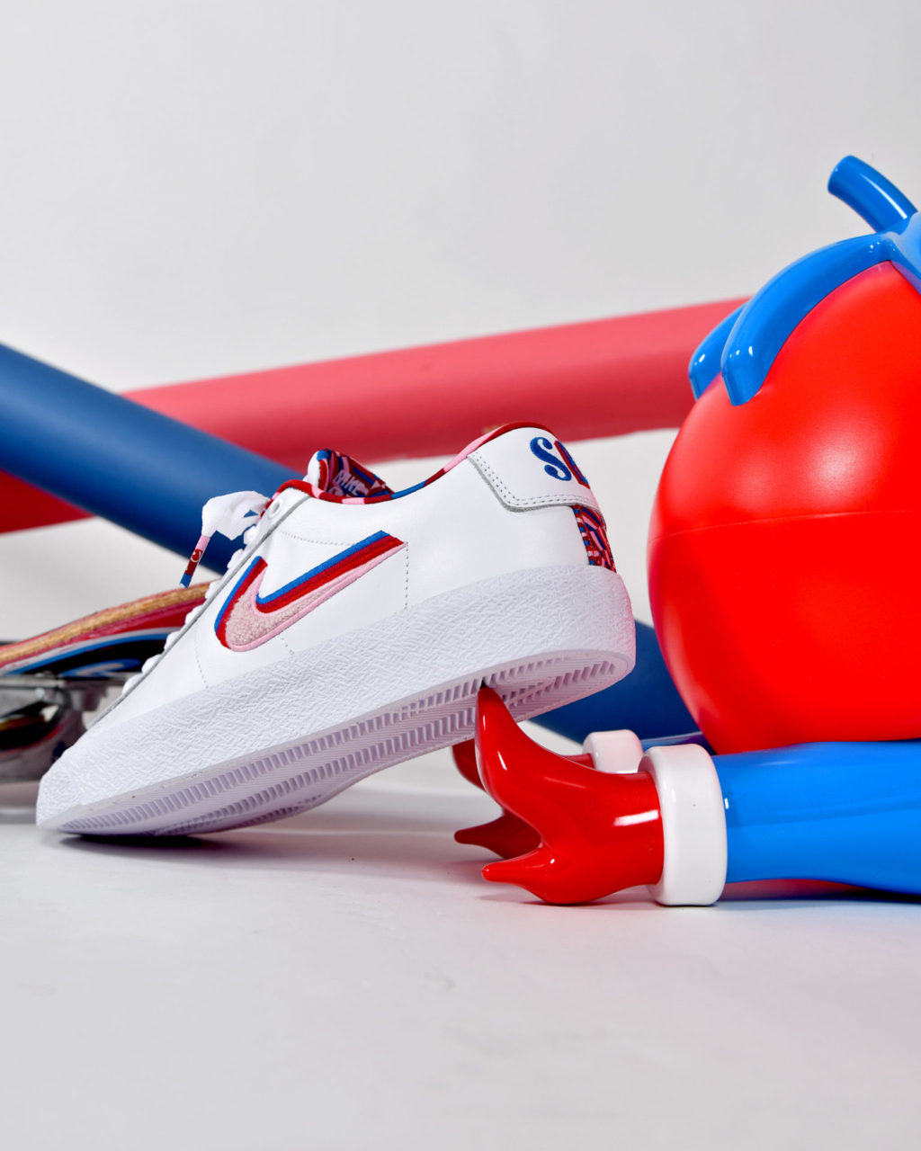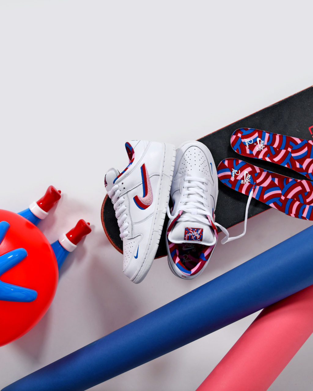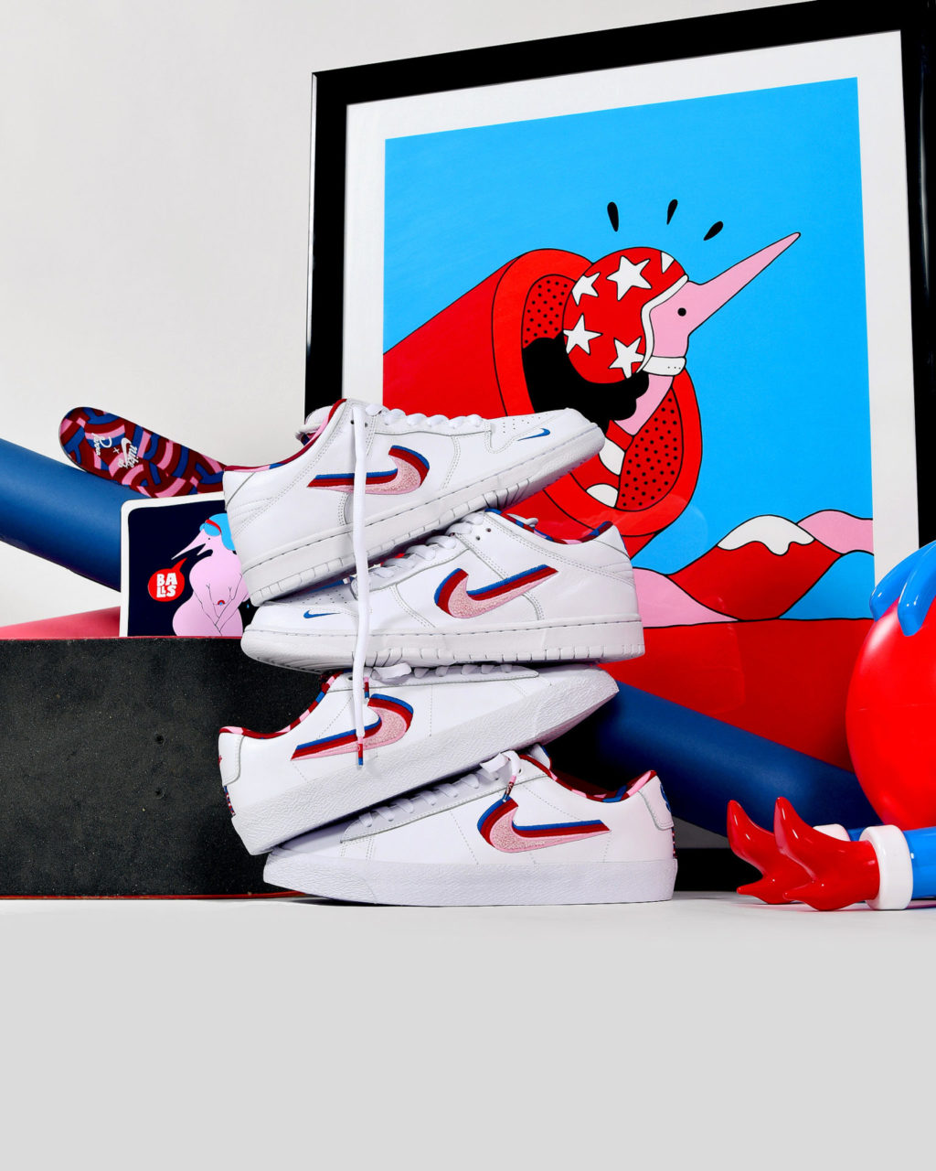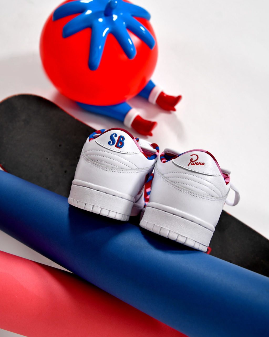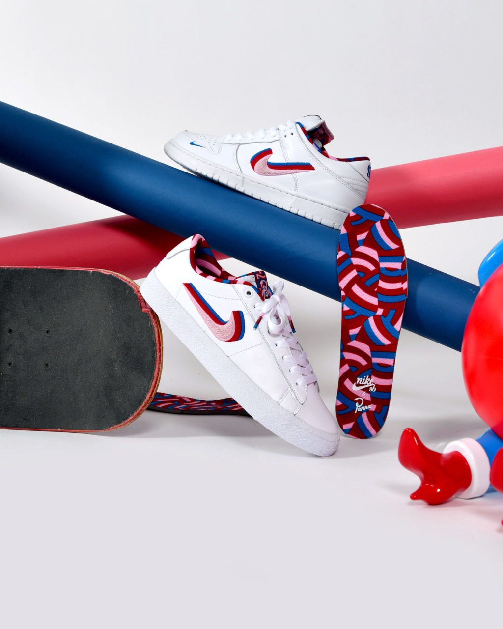 Pour cette Nike SB Dunk Low et cette Nike SB Blazer Low, on reconnaît très facilement la patte de l’artiste avec des détails colorés présents sur l’ensemble de la tige. La paire est constituée d’un cuir premium blanc. On retrouve l’emprunte graphique de Parra sur les profils avec une superposition de Swoosh bleu, rose et rouge. La virgule est d’ailleurs beaucoup plus petite sur cette itération que sur les modèles traditionnels de Dunk Low. Un mini Swoosh est présent sur l’extérieur de la toebox. La doublure est en tissu et on y retrouve des nombreux imprimés caractéristiques de l’artiste hollandais. Des broderies figurent aux talons, l’un dispose du logo SB revisité et l’autre de la signature de Parra. Son logo est également présent sur la languette, toujours avec des formes géométriques colorées. Enfin, la tige repose sur une semelle classique entièrement blanche.