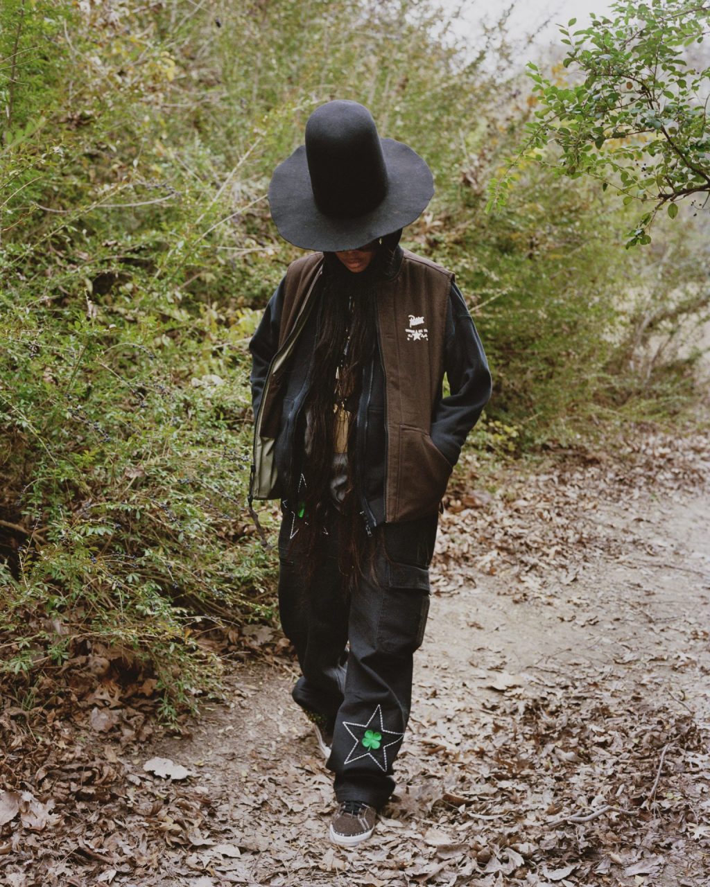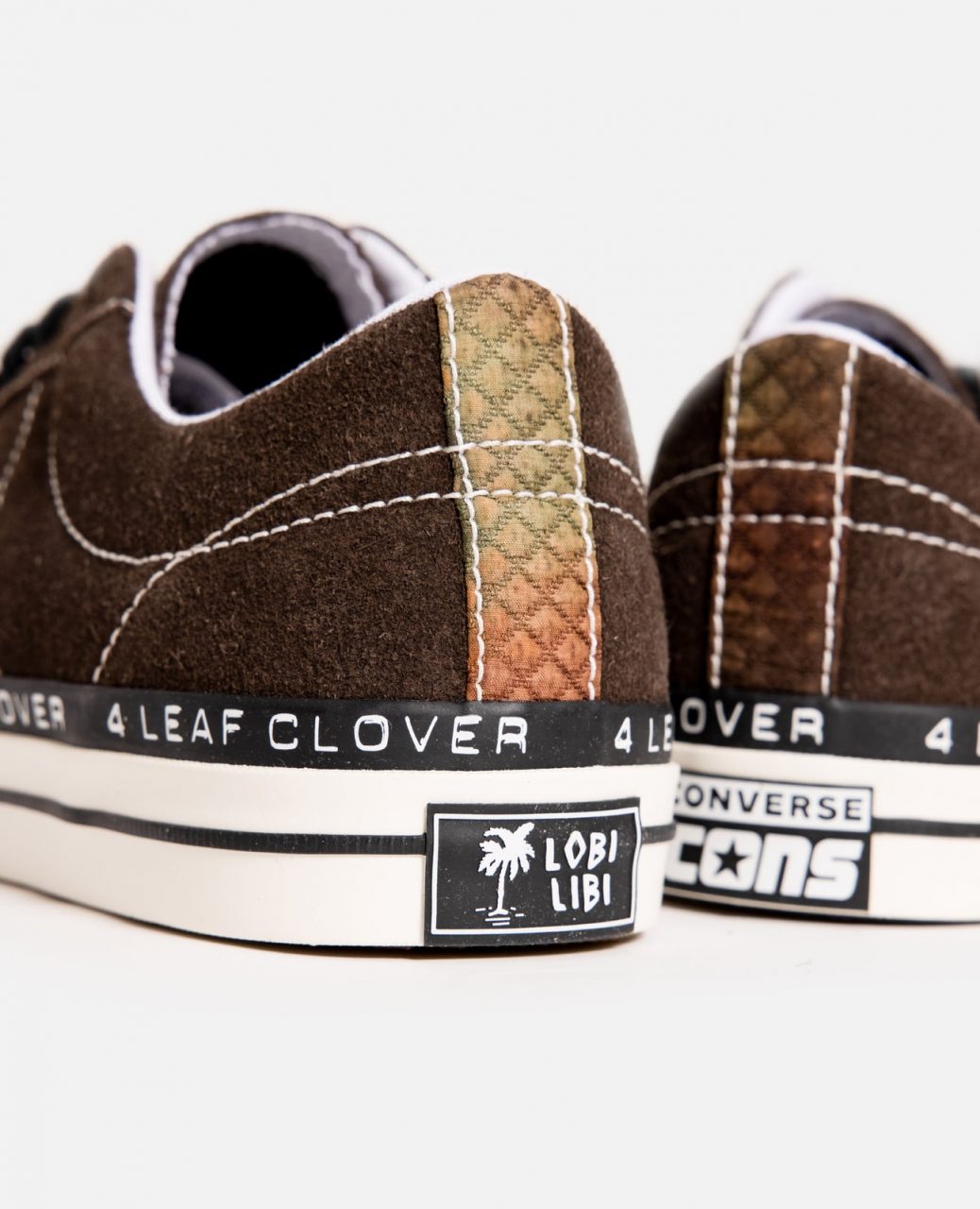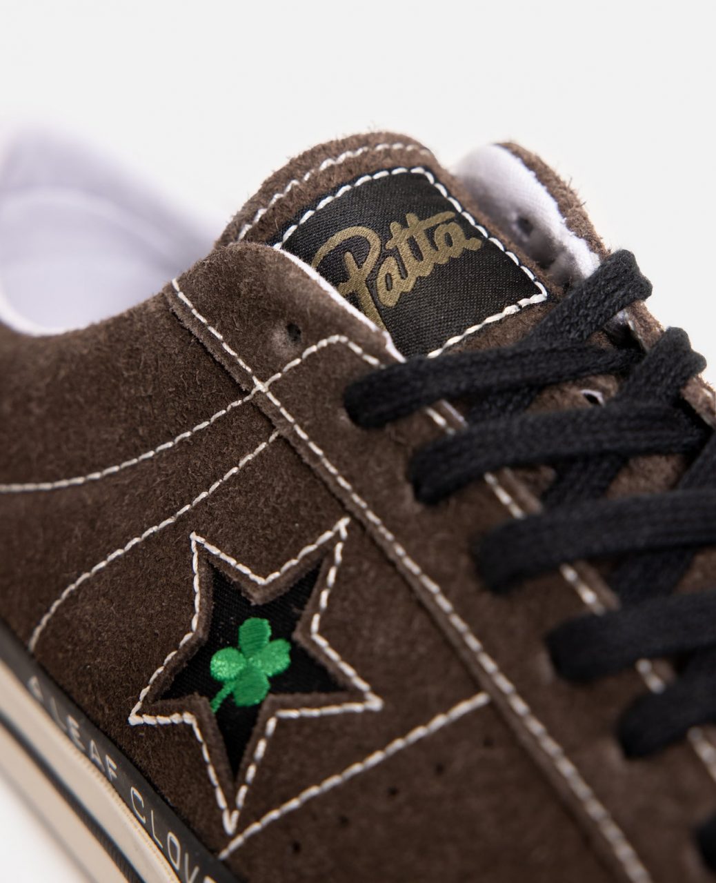 Pour incarner cette nouvelle collaboration Patta x Converse – 4 Leaf Clover, le shop d’Amsterdam a choisi Erykah Badu comme ambassadrice. La chanteuse Américaine incarne le thème par sa passion pour la nature et la quête de sa chance dans cet environnement organique. La collection s’ouvre par une Converse One Star Pro OX 4 Leaf Clover. Sa tige basse est construite en cuir suédé marron, légèrement peluché. Il est sublimé par des coutures blanches, ajoutant du relief à la paire. Les lacets plats nous s’accordent au liseré supérieur de la semelle intermédiaire, traversé d’inscriptions 4 Leaf Clover. Le reste de la semelle est blanc, et reprend la construction classique des semelles Converse, se terminant par un cartouche au talon. Ici, il porte l’inscription Lobi Lobi de Patta. Pour marquer cette collaboration, Patta imprime son nom sur l’étiquette noire de la languette. Les panneaux latéraux reprennent l’étoile de la One Star et y ajoutent la broderie verte d’un trèfle à quatre feuilles.