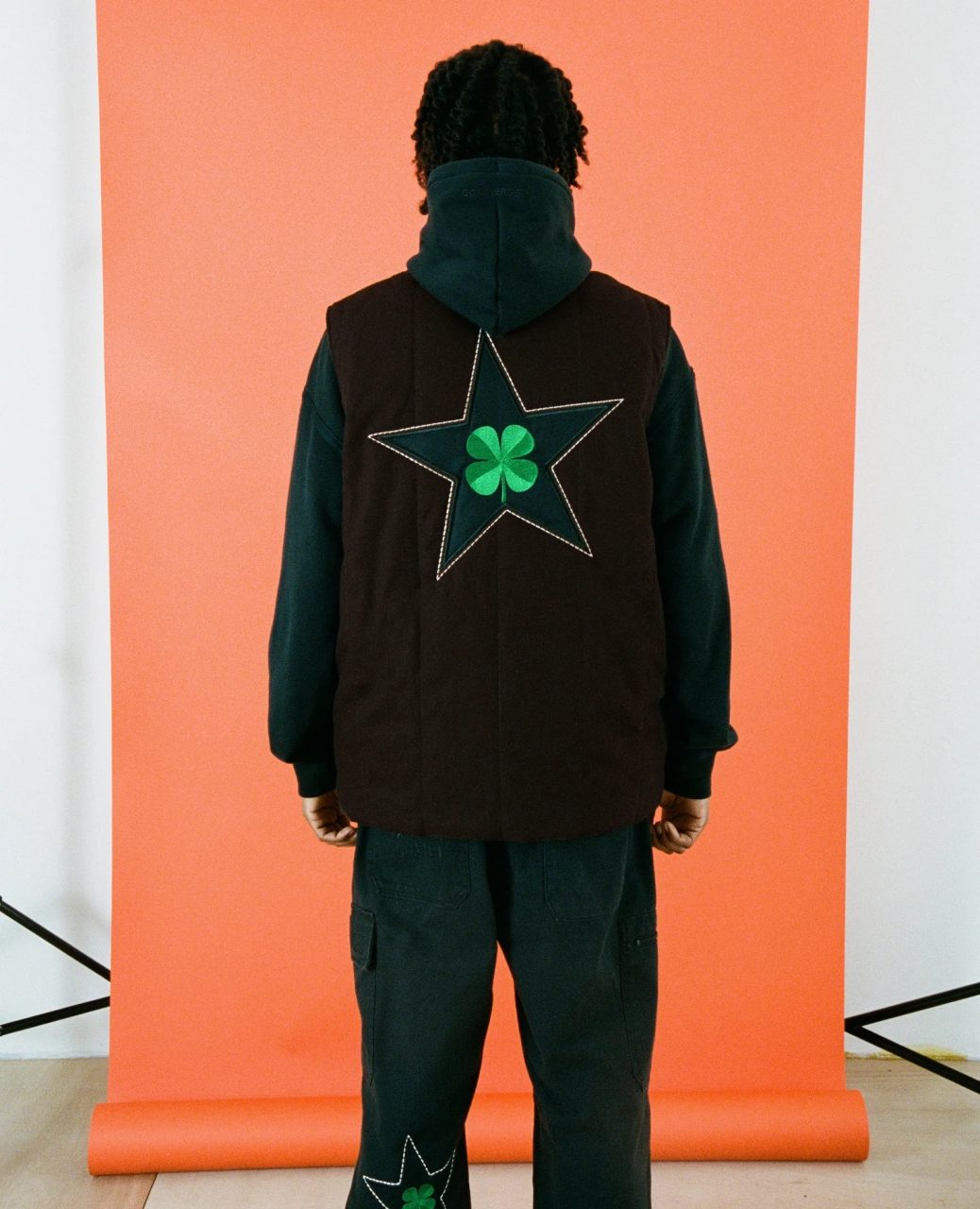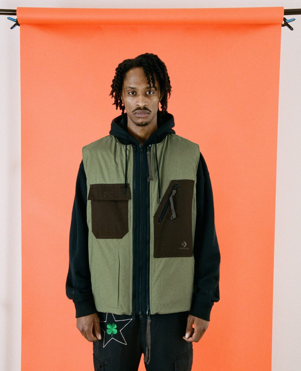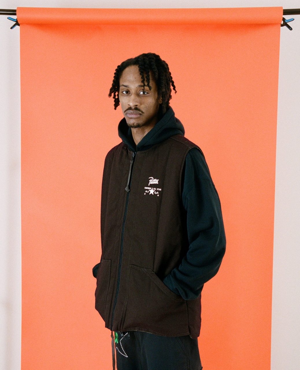 Pour accompagner ces tee-shirts, un pantalon cargo noir complète la capsule. Les multiples poches alternent entre fermeture zip et scratch, et sont brodées des noms de Patta et de Converse, ou encore du fameux Lobi Lobi. Trois patchs étoile apportent de la couleur en entourant un trèfle vert. Pour clore cette capsule inédite, Patta et Converse ont travaillé sur une veste sans manches réversible. Un côté en canvas marron est brodé du logo de la collection au dos, tandis que l’autre côté arbore du Ripstop kaki. Il porte également deux poches marron sur son avant, et son dos est imprimé d’un imposant logo Patta en ton sur ton.
