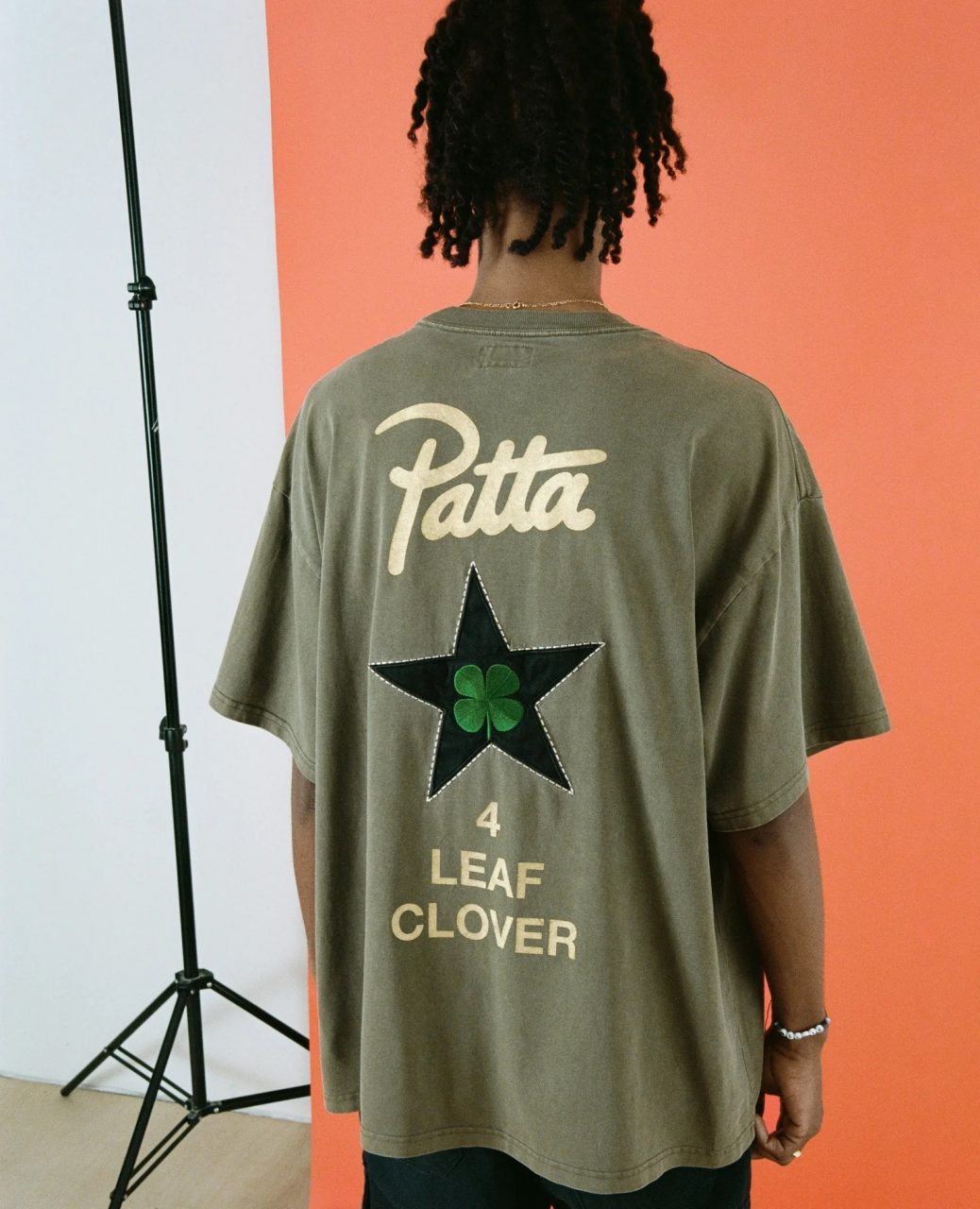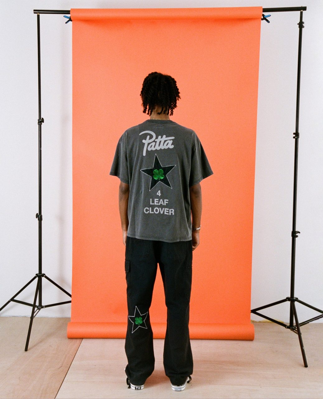 Côté textile, la collection Patta x Converse – 4 Leaf Clover se compose de quatre pièces. Un tee-shirt manches courtes à l’effet délavé est présenté dans les coloris noir et kaki. Il porte les logos des deux marques sur la poitrine, tandis que son dos est brodé d’une étoile noire, accompagnée d’un trèfle vert. Des impressions Patta 4 Leaf Clover finalisent ce graphisme au dos. Dans le même esprit, un hoodie zippé noir intègre cette capsule et porte des brandings similaires aux tee-shirts.