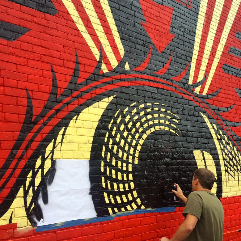 L’époque où Shepard Fairey, le créateur de la marque Obey et icône du street art, réalisait ses œuvres de nuit en toute illégalité semble bien révolue. Depuis, la plupart de ses travaux sont faits avec l’accord des villes et des propriétaires des lieux. Malgré ce manque d’authenticité qui faisait le charme de ses pochoirs et autres poses d’affiches, cela a permis à Shepard Fairey de proposer des pièces bien plus travaillées sur des surfaces vraiment plus importantes.