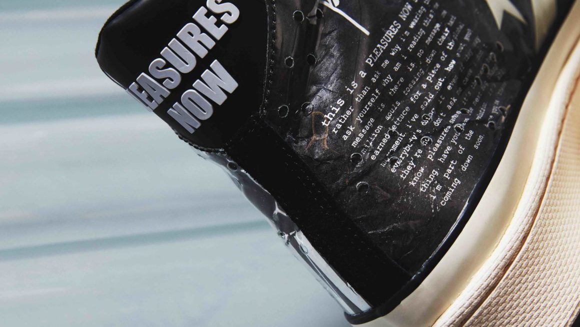 Ce thème original a été proposé par Alex James, le fondateur du label Pleasures, et est directement issu de ses souvenirs de jeunesse à Los Angeles et New-York lorsqu’il fréquentait assidûment le milieu punk. Ses icônes des années 80 et 90 ont ainsi défini le style graphique de ce projet. La paire est proposée dans un code couleur sobre avec du noir et du blanc. De nombreuses inscriptions figurent sur l’empeigne comme « Stop lying to yourself » ainsi qu’un texte complet sur la genèse de cette paire ou encore « Pleasures now ». La paire exhibe également des dessins divers issus de l’univers punk et notamment plusieurs logos.
