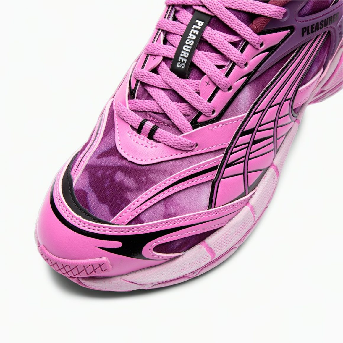 La silhouette de la Pleasures x Puma Velophasis Overdye tire son inspiration des runnings des années 2000. La base de son empeigne est construite en tissu Ripstop, visible sur la toebox, les panneaux latéraux et le col de cheville. Il se pare d’une coloration tie and dye, oscillant entre le rose et le violet. Des empiècements en cuir rose, liserés de noir, viennent renforcer la tige au niveau du garde-boue avant, des passages de lacets, ainsi que du quart arrière. Ce dernier porte une inscription noire Pleasures sur une pièce en TPU légèrement translucide. Elle ajoute au côté futuriste de la paire, tout comme le Formstrip rose, liseré de noir. La languette est embossée d’une inscription Puma blanche, et porte des lacets plats rose. Le sockliner bordeaux apporte du contraste à la tige en camaïeu de rose. Le heeltab porte un cartouche rose, gaufré d’un Puma violet. Cette nouvelle création de la marque allemande repose sur une imposante semelle intermédiaire rose à effet usé, complétée par une semelle extérieure plus foncée, débordant sur le devant de la paire.