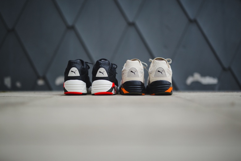 Le design de la sneaker est fondé sur la Puma Blaze of Glory avec une tige légèrement plus basse. Un formstripe est réintégré sur le côté et la languette est attachée seulement sur un côté. Deux déclinaisons sont proposées en édition limitée. La première est toute noire, en mesh et cuir. Ce dernier imite un cuir de crocodile. La seconde a un look plus outdoor. Ce sont toujours les mêmes matières qui ont été associés mais avec du beige, du noir, de l’orange et du khaki.