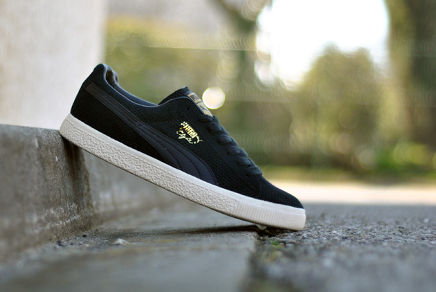 Puma lance une nouvelle déclinaison de sa mythique Puma Clyde avec la Puma Clyde URB. L’empeigne de la paire est en cuir suédé perforé noir. Des lacets fins noirs accompagnent les sneakers dont les seules petites touches de couleur se situent au niveau du nom et de la languette avec des imprimés de couleur or.