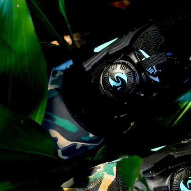 Pour cette année, il s’agit encore de cette même silhouette en l’occurrence inspirée d’un univers totalement différent, la jungle. La paire, connue pour son système de serrage à disque, est recouverte d’un imprimé camouflage en cuir suédé à l’avant. Elle se compose également d’une partie en mesh noir ainsi que des détails en bleu turquoise comme le stripe et les différents logo de la marque au félin. On retrouve à l’intérieur les logos des deux entités imprimés sur la semelle.