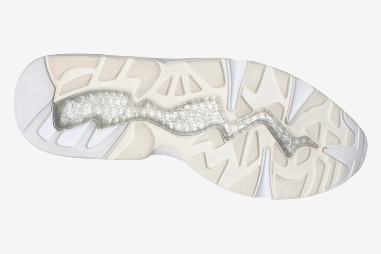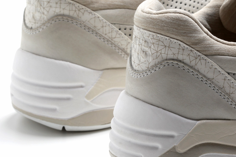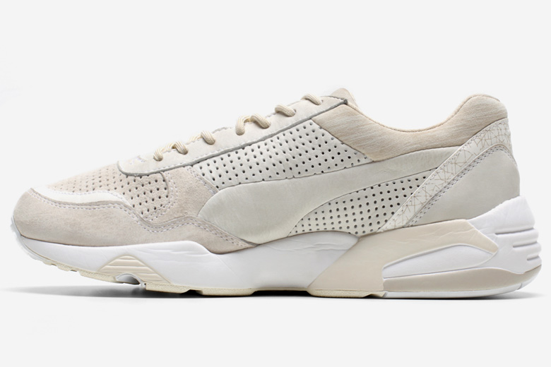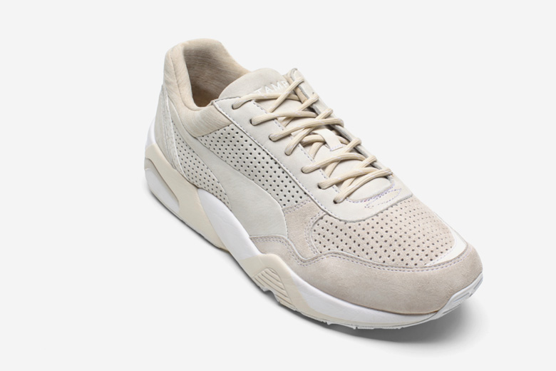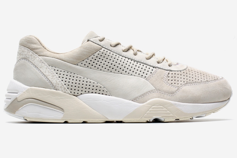 Cette paire a été modernisée avec un form-stripe (logo Puma) sans coutures qui se fond dans l’empeigne construite à partir de plusieurs types de matériaux intéressants comme le cuir perforé, le nubuck et la touche de jersey présente autour de la cheville.