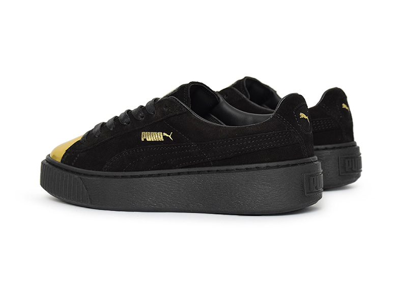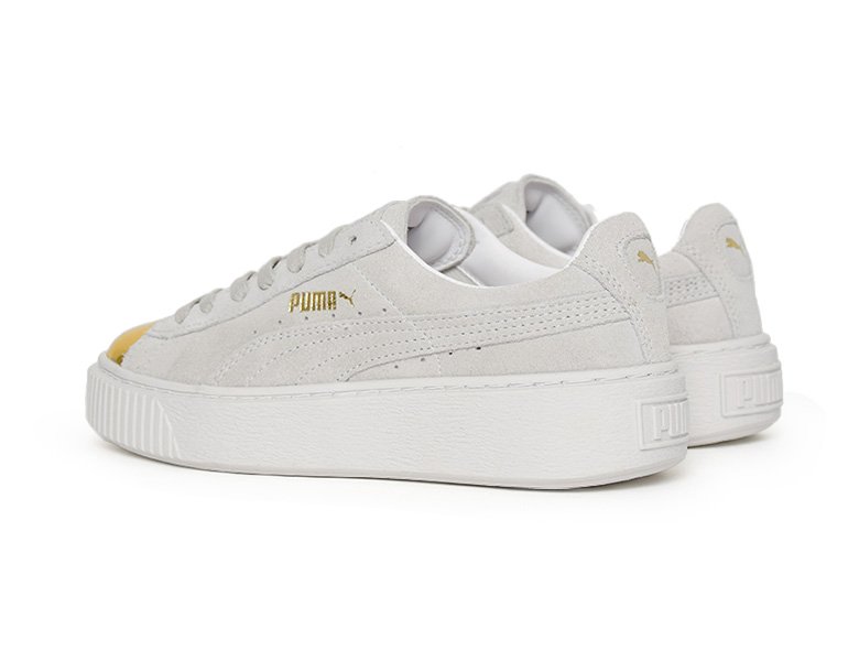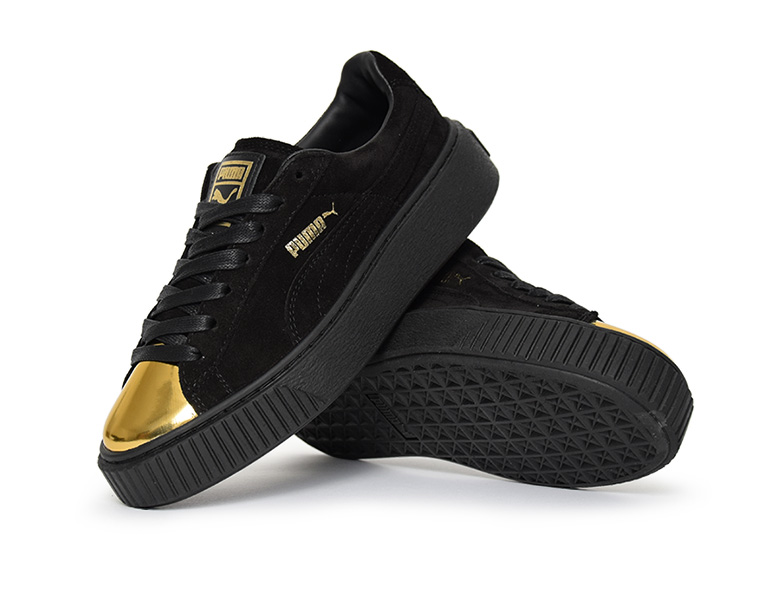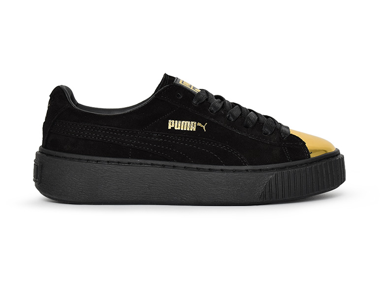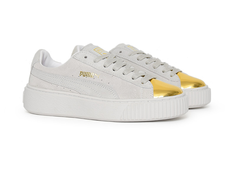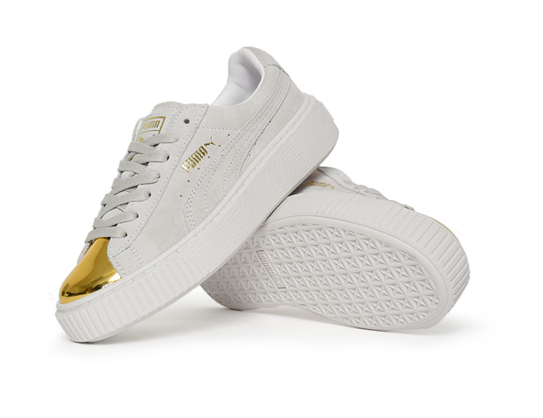 Ce duo de Puma Suede Platform est le « Gold Pack ». On retrouve en effet quelques touches de doré sur l’avant du pied, les différents logos placés sur la languette, le coté ainsi qu’au talon. Chaque sneaker est en daim, blanc cassé ou noir, dont la teinte est reprise sur la semelle extérieure pour un rendu monochrome. La Puma Suede Platform est une nouveauté de la collection automne/hiver 2016.