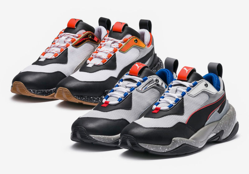 Deux coloris inédits seront donc proposés : une combinaison de noir, gris et orange a été appliquée sur le premier modèle tandis que le second arbore une palette de gris, de bleu et de rouge. Au même titre que pour le coloris Spectra, chacune des paires disposera d’une empeigne au design complexe sur laquelle s’entrelacent des couches successives de cuir ainsi que des empiècements en mesh bien visibles ici. On retrouve d’ailleurs ce matériau pour le rembourrage intérieur. Un traitement tacheté équipe les deux semelles extérieures de cette nouveauté Puma au profil chunky complétement assumé. De nombreux détails apparaissent dans ces deux coloris clairs: la tirette au talon ainsi que sur la languette, l’empiècement supportant les passants des lacets et son look premium ou encore les juxtapositions de matières créant cette semelle bulky en 3D. Puma a clairement souhaité doter sa Thunder d’un look haut de gamme.