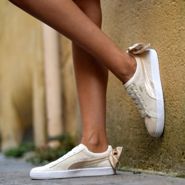 La Puma Suede est déclinée dans une version féminine équipée d’un nœud en satin au talon