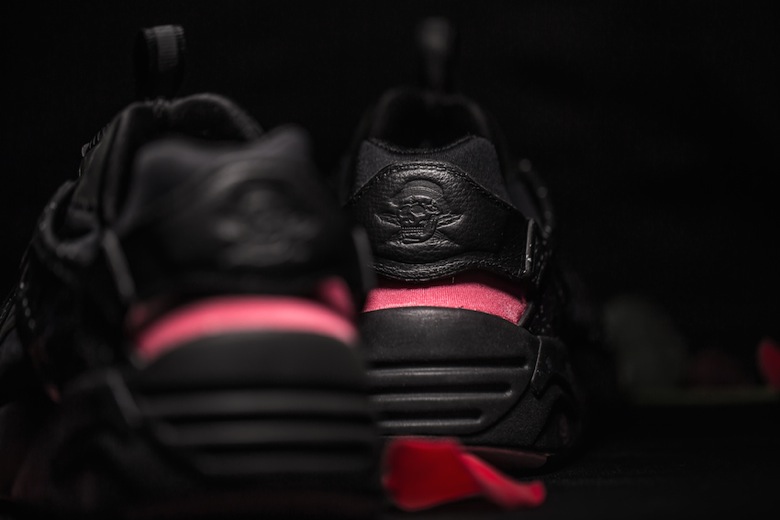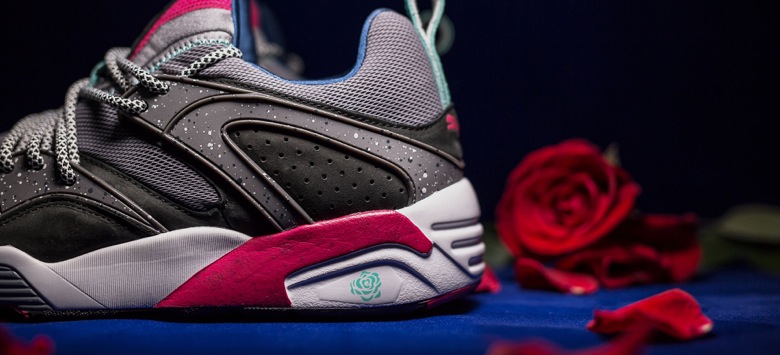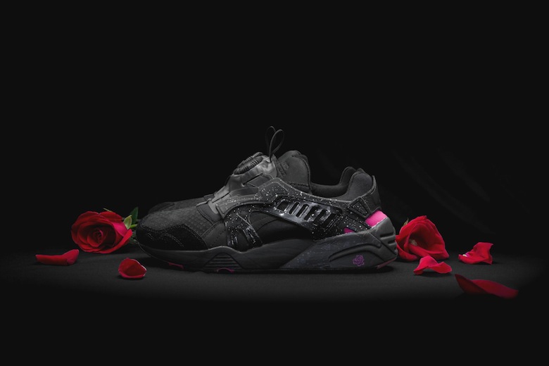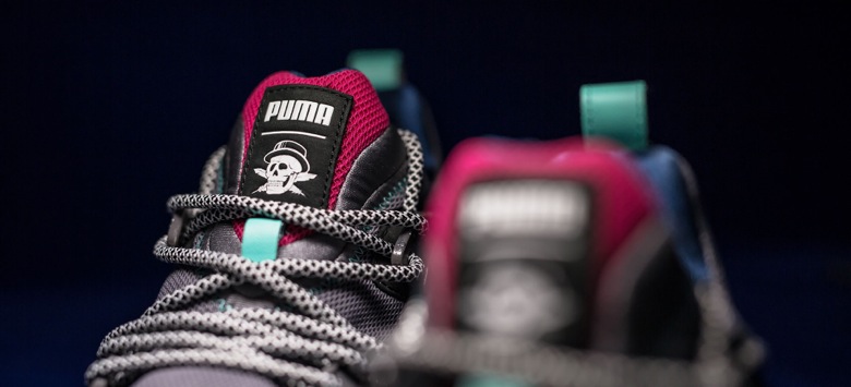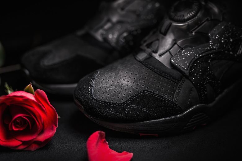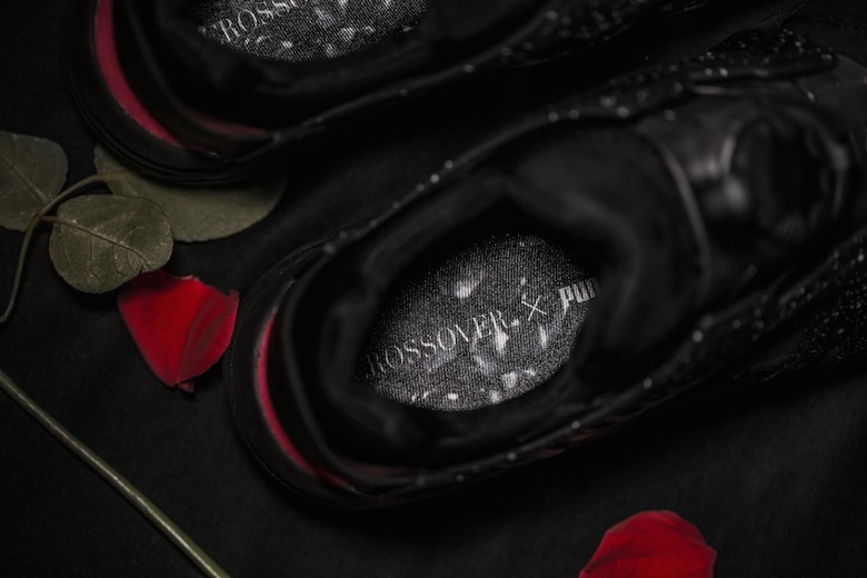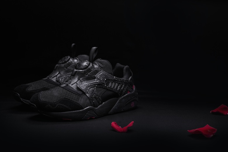 La première sneaker est une Puma Blaze of Glory surnommée « Roses ». Celle-ci s’inspire de la scène d’ouverture du film où apparaissent donc plusieurs roses, fleurs que l’on retrouve en petit sur la semelle de cette sneaker à la place du logo Puma Trinomic. La paire est faite d’un mélange de mesh et de nubuck gris avec plusieurs touches de couleurs comme du rose, du vert et du bleu. Le second modèle imaginé par Crossover est une Puma Disc Blaze revue dans une version premium et sobre. En effet, cette dernière sera principalement noire avec des accents roses présents à l’arrière du pied et sur la semelle extérieure. On retrouvera sur ces deux sneakers du Velvet Twin Pack le logo du shop en forme de crâne.