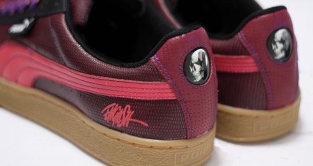L’artiste Américain Ron English est à mi-chemin entre le Pop Art et le Street Art. Habitué des détournements, il a joué pendant des années avec l’iconographie de multinationales (McDonalds entre autres) ou de personnages célèbres (Marilyn Monroe mixée avec Mickey ou encore Obama avec Lincoln). Il a travaillé avec Puma sur son modèle favori, la Puma Suede. Deux séries de Puma Suede ont été créées, une version basse et une version haute, avec la signature de l’artiste sur chacune d’entre elles. Les paires sont présentées en détails dans la suite de cette news.