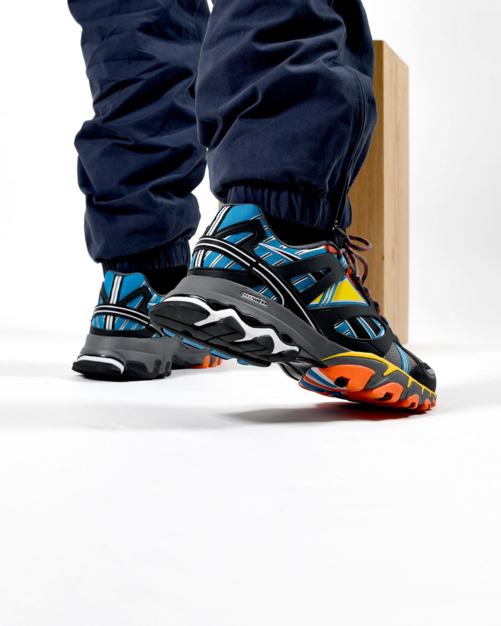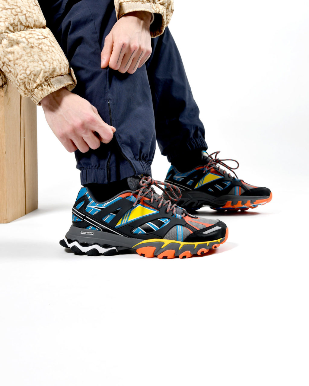 Nous vous présentons ici le coloris Cold Grey/Conrad Blue de la Reebok DMX Trail Shadow. La silhouette de la sneaker rappelle la tendance actuelle des maisons de luxe à s’inspirer des modèles outdoor pour leurs produits. Sur une empeigne rappelant quelque peu celle de la Ventilator, du mesh gris habille la toebox. Du ripstop noir est utilisé à l’avant et devient bleu au talon pour renforcer la paire. Des empiècements en caoutchouc noir servent de cage à l’empeigne et consolident l’idée d’une paire stylée, mais très robuste. Pour finir, des pièces thermocollées ajoutent de la couleur et du style à la sneaker. La semelle anthracite est parée de détails orange, jaunes ou encore noirs brillants et bénéficie de la technologie DMX pour un amorti de qualité. Avec un Vector discret sous la cage, la languette est là pour rappeler la marque et le nom du modèle.