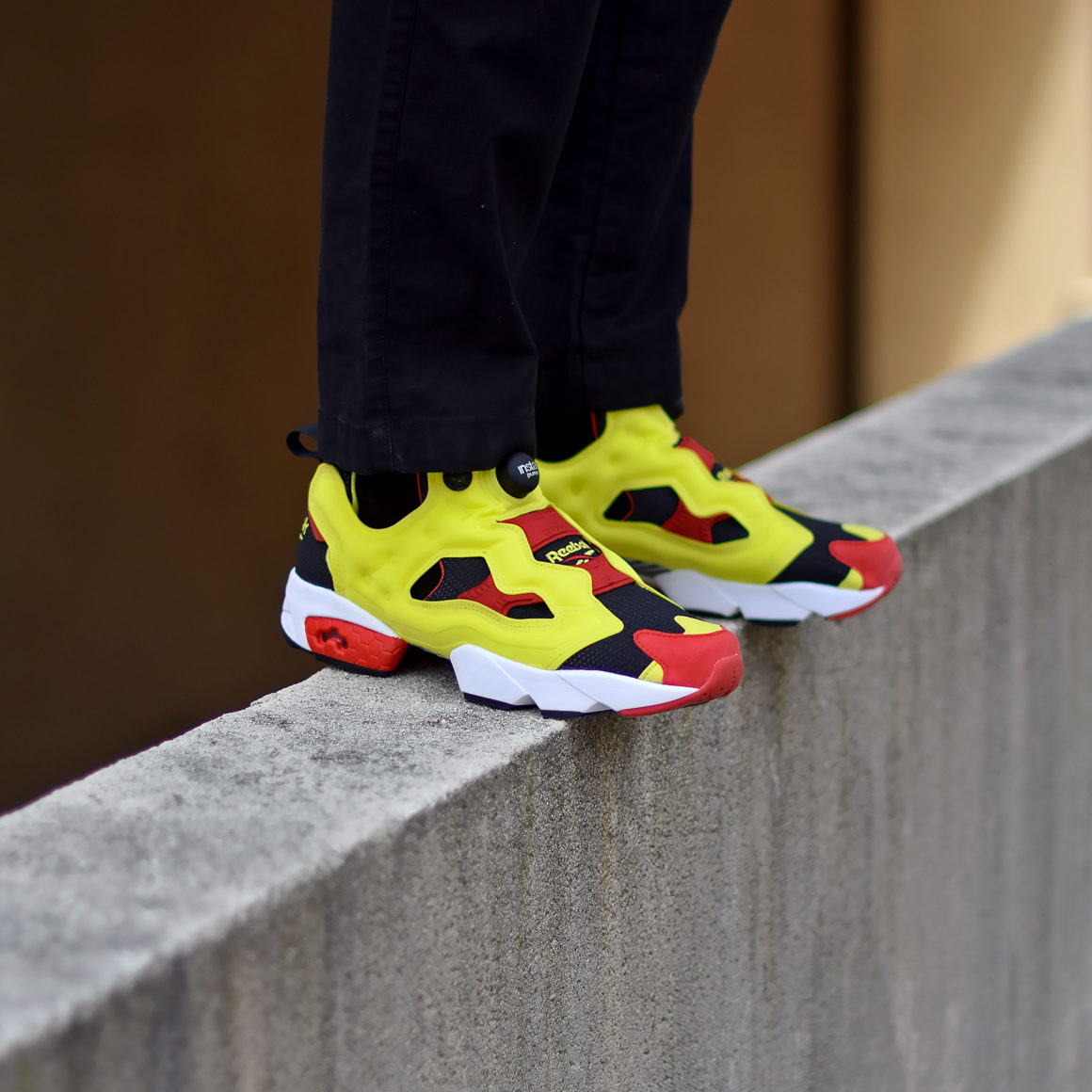 Les deux moutures présentées ici bénéficient d’éléments qui ont forgé la réputation de cette sneaker. Chaque modèle est équipé de la technologie « Pump-to-fit » qui remplace le système de laçage plus conventionnel. Ce système, emprunté à la Reebok Pump, se manipule à l’aide d’une pompe noire placée sur le haut de la languette. Le design de ce modèle est très avant-gardiste car l’empeigne est découpée en deux empiècements qui se chevauche, l’un en mesh et l’autre en suède. Deux tirettes sont appliquées au talon et sur la languette, une caractéristique de l’Instapump Fury OG. La sneaker repose sur une semelle spécifique à technologie d’amorti DMX divisée en deux parties distinctes. Elle est ainsi évidée au milieu pour offrir un look hors du commun. Les deux coloris sont fidèles à ceux de l’époque de sortie de la Reebok Instapump Fury. La paire « Citron » remaniée à plusieurs reprises reprend ici l’association de jaune citron, de rouge et de noir. Toute aussi vibrante, la seconde paire est également proposée dans un code couleur tricolore noir, blanc et bleu clair.