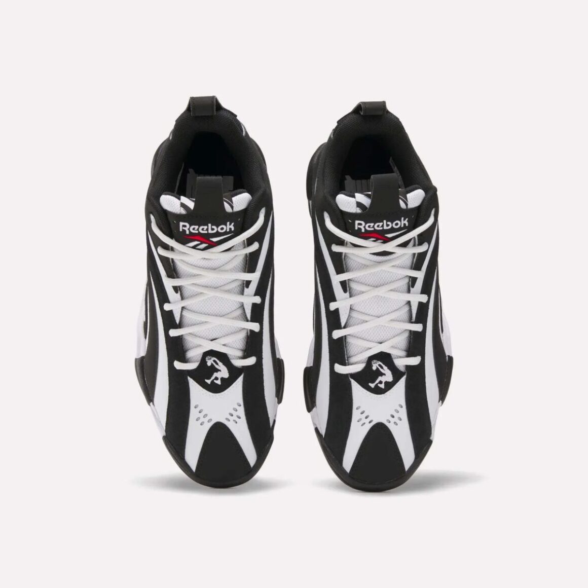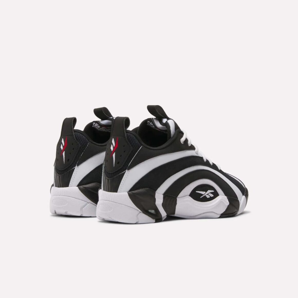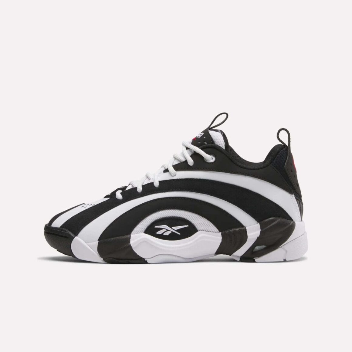 L’une des caractéristiques les plus marquantes de la Shaqnosis depuis son origine, ce sont ses motifs tourbillonnants et ses formes qui semblent toujours en mouvement. Pour cette version Low 2026, ces éléments sont réinterprétés de manière à flatter une empreinte visuelle plus compacte mais tout aussi impactante. Le jeu de courbes, de lignes ondulantes et de zones contrastées reproduit une sensation de rotation et d’énergie, comme si la sneaker elle-même captait et exprimait la force cinétique d’un dribble ou d’un saut. Cette dynamique visuelle n’est pas simplement décorative : elle évoque l’essence même du basketball et de l’athlétisme, transformée en un langage graphique. Parée de blanc et de noir, la tige produit un effet hypnotique garanti, se prolongeant jusqu’à la semelle. La base de la languette porte un logo Shaq, tandis que la base de l’empeigne est brodée du célèbre Vector de Reebok. On le retrouve en version blanche et rouge au sommet de la languette, ainsi qu’au talon.