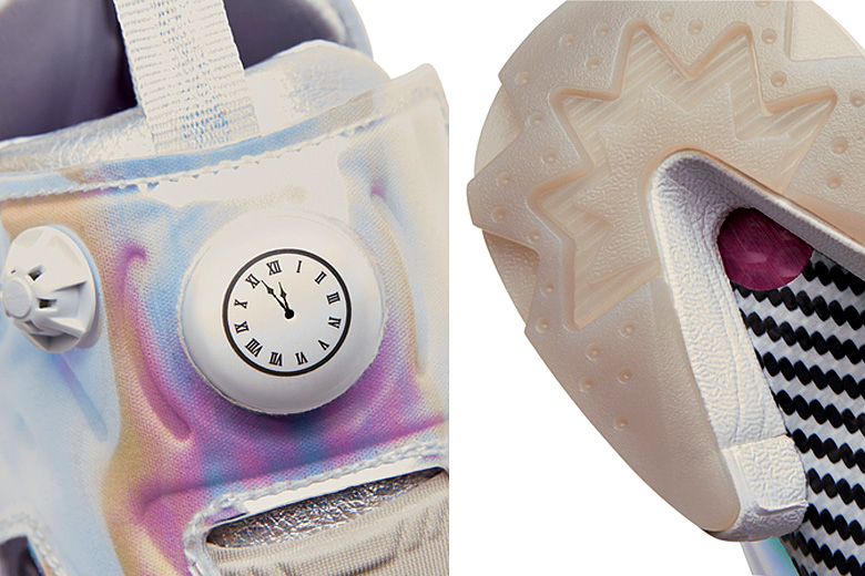 Ces éléments ont été retranscrits par Reebok sur ces paires de Insta Pump Fury. En effet on retrouve l’horloge à la place du système Pump et le rendu de la paire de sneakers est assez réussi grâce à l’utilisation d’un cuir argenté et des empiècements au rendu iridescent.