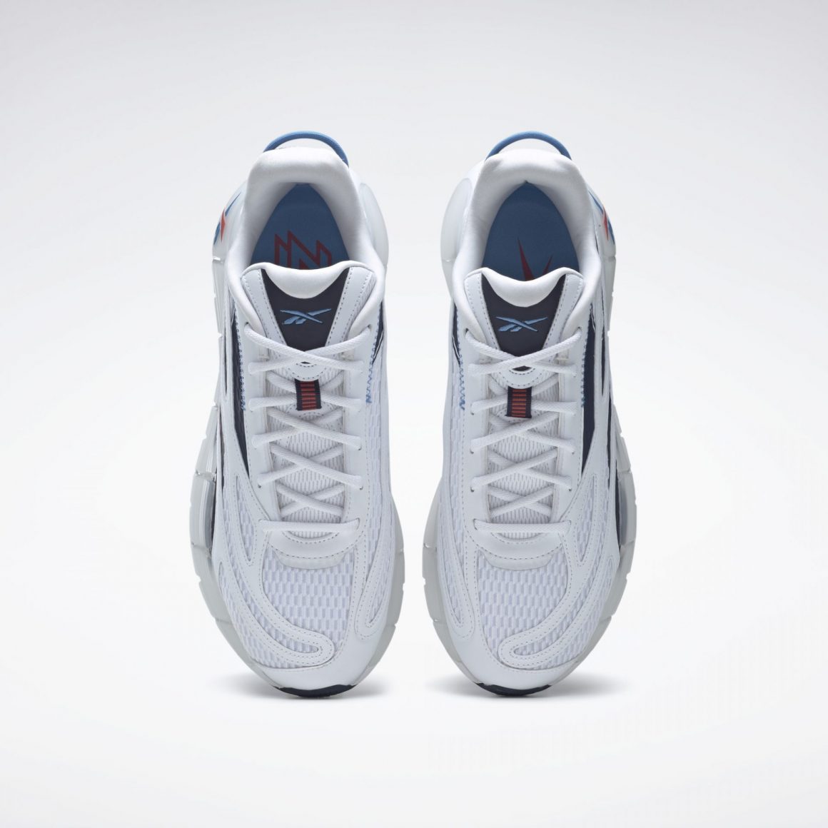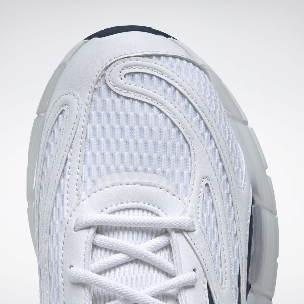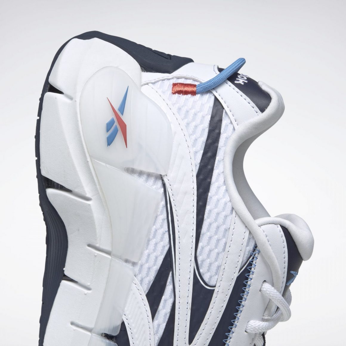La silhouette basse de la Reebok Zig Kinetica 2.5 Essential Blue est construite sur une base en mesh blanc. Cette tige est renforcée par des empiècements en cuir lisse blanc, dont la découpe ajoute au dynamisme de la paire. D’imposants Vector marine sont imprimés sur les panneaux latéraux et s’accordent au sommet de la languette, brodé d’un Vector bleu ciel. Ce bleu ciel se retrouve sur les coutures zigzag à la base des passages de lacets, ou sur la tirette au talon qui traverse un cartouche marine, brodé d’un Reebok blanc. La semelle intermédiaire immaculée est renforcée par une Zig Energy Shell translucide, qui offre stabilité et maintien. Elle est embossée d’un mini Vector rouge et bleu ciel. Les technologies Floatride Fuel et Floatride Energy sont intégrées dans la semelle en zigzag pour garantir un amorti dynamique. Une semelle extérieure marine vient finaliser ce nouveau design de Reebok.