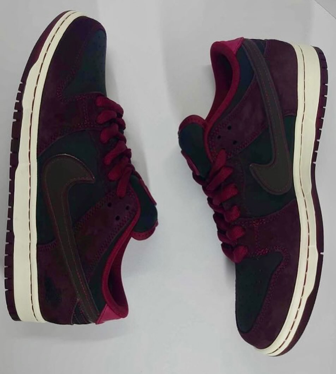 La Riot Skateshop x Nike SB Dunk Low tire ses influences directes des vignobles de Bordeaux, connus dans le monde entier pour leurs vins d’exception. Cette inspiration se reflète principalement dans le choix des couleurs et des textures, rappelant les teintes riches et profondes des cépages bordelais. La chaussure se distingue par une utilisation subtile de teintes de rouge bordeaux, qui évoquent le vin rouge classique, tout en restant élégante et contemporaine. Les touches de cuir vert profond, présentes sur les panneaux latéraux et l’avant-pied, ajoutent une dimension luxueuse au modèle et évoquent les bouteilles du breuvage girondin. De plus, la semelle intermédiaire crème contraste parfaitement avec la tige colorée, apportant une touche de modernité à cette collaboration qui allie tradition et style. Pour signer la collaboration, la boutique bordelaise appose son logo sur le sommet de la languette, le quart arrière de la sneaker, ainsi que sur la semelle intérieure. Cette dernière est en liège, en référence directe aux bouchons éponymes. Pour finaliser ce design, Riot et Nike se partagent les heeltabs, en apposant leurs noms dessus.