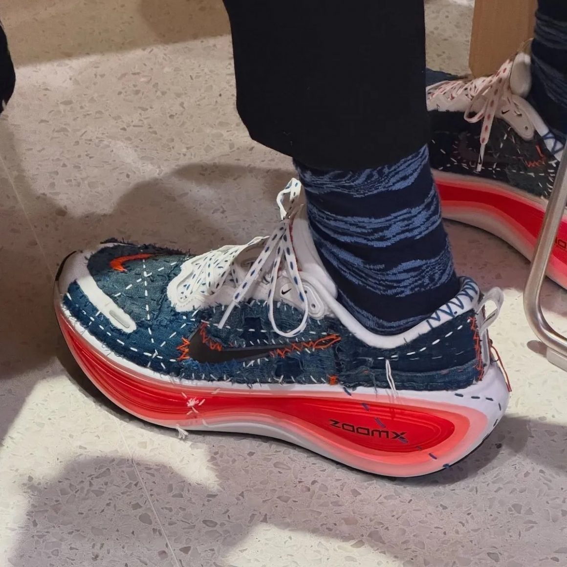 Cette exclusivité prend une dimension particulière puisqu’elle a été réalisée pour Tim Cook lui-même. Grand amateur de running et figure emblématique de la tech mondiale, le dirigeant d’Apple reçoit ici une paire qui fait écho à son univers. Le contraste entre la high-tech de son quotidien et l’artisanat manuel du Sashiko reflète une dualité intéressante : la rencontre de deux mondes qui, en apparence opposés, reposent tous deux sur l’idée d’innovation et de précision. L’attention portée aux détails rappelle également le souci de perfection que l’on associe aussi bien à Apple qu’aux artisans japonais. La création est portée par des tons bleus, typiques du Sashiko, ainsi que par une imposante semelle blanche et rouge, ajoutant du contraste à la sneaker. Du choix des matériaux aux finitions, chaque élément de cette Vomero a été pensé pour créer une pièce d’exception, à la fois fonctionnelle et profondément symbolique.