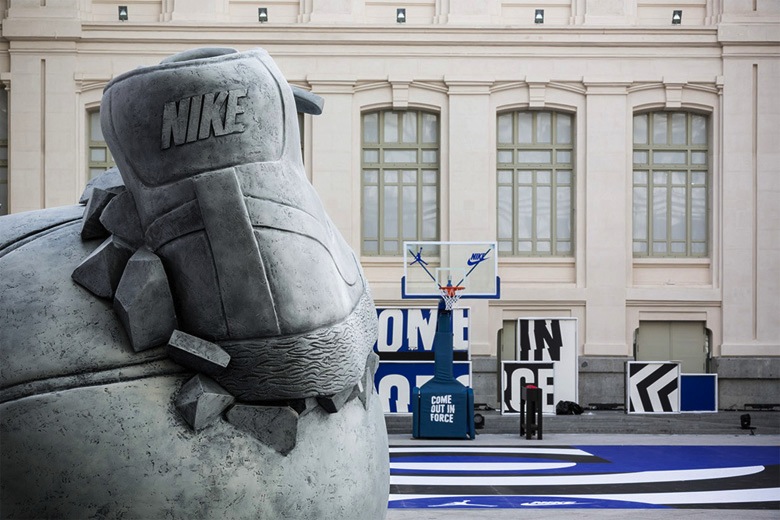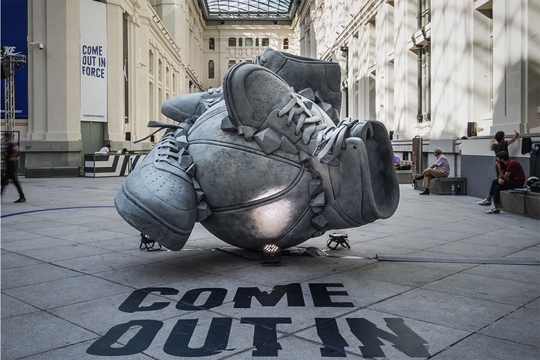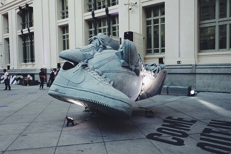 À l’occasion de la coupe du monde de basketball en Espagne, Nike a tenu plusieurs événements dans les plus grandes villes espagnoles. C’est à Madrid que s’est par exemple tenu un Sneakerball dédié à la balle orange. À cette occasion, Nike a demandé à l’artiste Shane Griffin de réaliser une sculpture monumentale. Ce sont les iconiques Nike Blazer et Nike Air Force 1 qui ont été reprises et mêlées à un ballon de basket. Vous pourrez apercevoir d’autres images dans la suite.