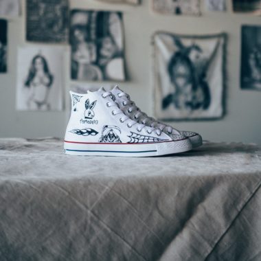 Deux coloris ont été imaginés, l’un rouge l’autre blanc. Chaque paire est proposée dans sa version montante classique en canvas dont l’empeigne de couleur présente de nombreux croquis réalisés par le skateur lui-même. Ces esquisses sont inspirées de sa vie à Los Angeles, de ses tatouages et des différents designs qu’il utilise pour son label Paradise NYC. On retrouve notamment une toile d’araignée à plusieurs endroits, les inscriptions « Until the light takes us » et « I Love You » ou encore le Yin et le Yang. Ces détails sont également présents sur les languettes, le talon, les semelles intérieures et même le toe-cap en caoutchouc.