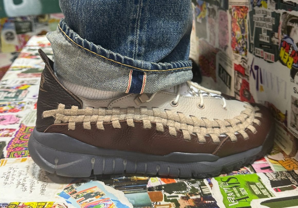 La Soulgoods x Nike Homescape Woven repose sur une structure unique. D’un côté, le profil fait référence à la tradition Nike Footscape et aux modèles tissés qui ont marqué les années 2000. De l’autre, l’empreinte technique se manifeste par une semelle inspirée de la Nike SFB Boot : robuste, crantée, conçue pour résister et durer. La tige, quant à elle, adopte un tissage aux mailles larges, combiné à des panneaux en cuir premium et à des surpiqûres apparentes. Le talon se veut modulaire, le laçage évoque celui d’une bottine outdoor, mais l’ensemble garde une silhouette sneaker. Les détails Soulgoods font leur apparition subtilement : un patch au talon combinant le tigre emblématique du label et le Swoosh de Nike, des coutures surdimensionnées qui donnent une sensation artisanale, et un choix de matériaux qui rappelle autant l’héritage skate que celui de l’équipement outdoor. Le résultat : une chaussure qui semble née pour marcher en ville avec la même assurance que sur un sentier de forêt.