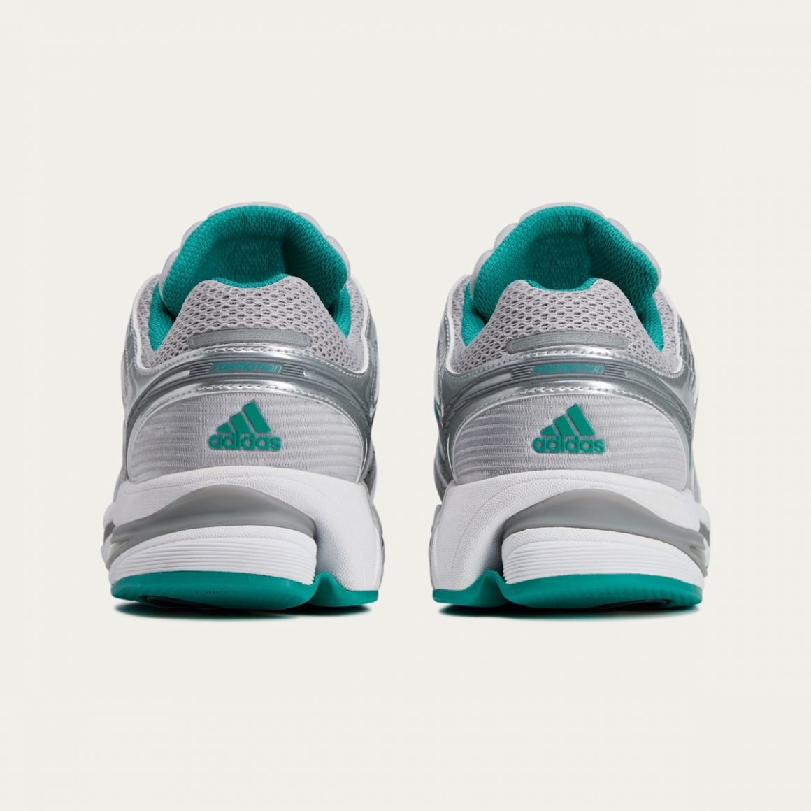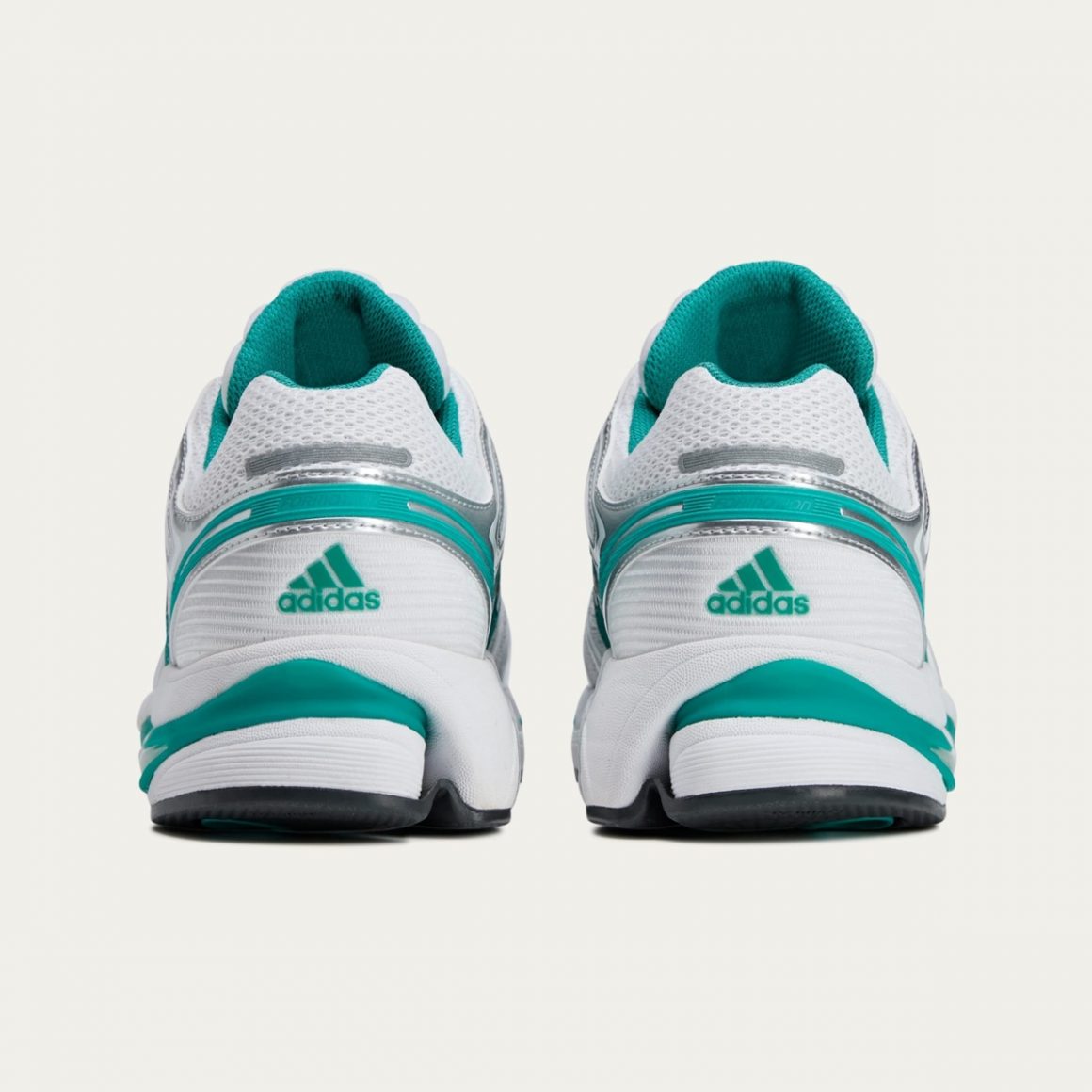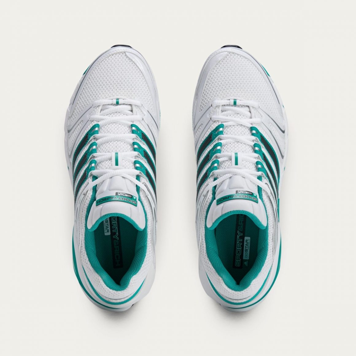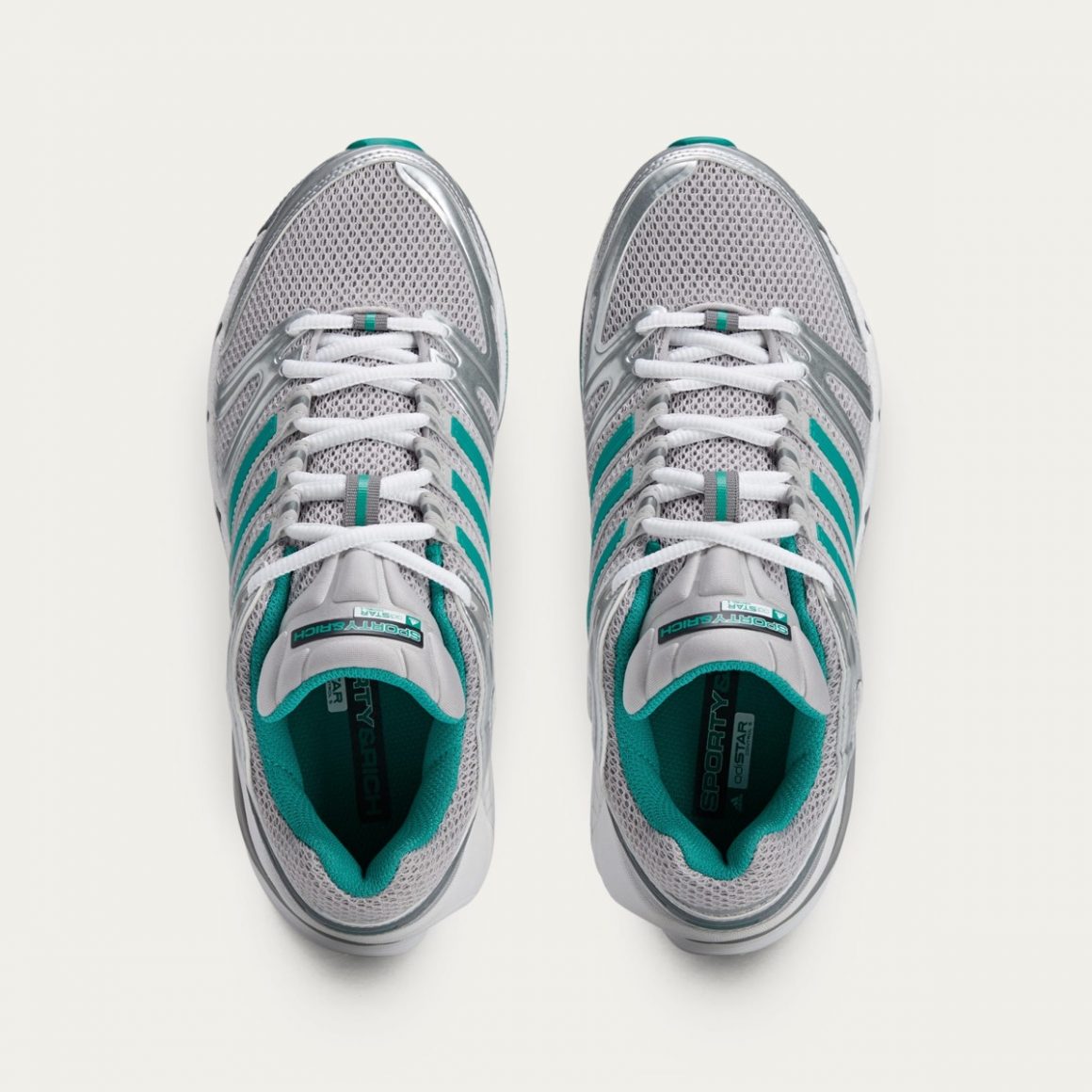 Cette première apparition de la adidas Adistar Control 5 se décline dans deux coloris spécialement pensés pour la collaboration. Le premier, tout en sobriété, associe des tons blancs et jade, avec des touches noires subtiles sur les trois bandes latérales, qui rappellent l’univers élégant de Sporty & Rich. Le second coloris se veut plus affirmé, avec une base aux tons argentés, relevés par des touches jade sur les bandes latérales. Dans les deux cas, l’esthétique demeure fidèle à l’identité minimaliste et rétro de la marque partenaire, avec un branding discret placé sur la languette et la semelle intérieure.