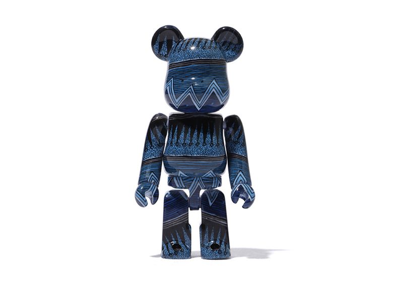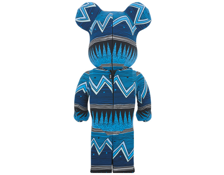 Sur la version la plus grande, cet imprimé tribal sera appliqué sur une housse amovible qui, une fois enlevé, laissera apparaitre un Be@rbrick tout noir avec le logo Stussy.