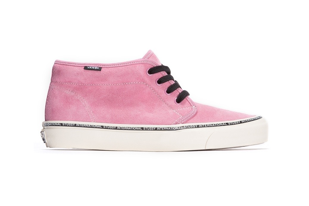 Pour ce nouveau projet, les designers de chez Stussy ont retravaillé trois silhouettes classiques de chez Vans avec la Old Skool, la Slip On ainsi que la Chukka. Pour la Vans Old Skool, on retrouve un mélange de cuir suédé rose, ou blanc cassé, associé à une toile épaisse (10 oz.). Sur les deux autres paires, l’ensemble de l’empeigne est en cuir suédé avec des coloris comme le bleu, le rose ou le blanc. Sur chacune des paires de cette collection Stussy x Vans Vault on retrouvera la mention « Stussy International » inscrite sur le liseré noir qui couvre les semelles extérieures.