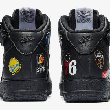 Il s’agit pour le moment de la Nike Air Force 1 Mid dans son coloris Black qui a été présentée (un coloris blanc devrait également faire partie de la collection). Depuis que Nike s’est offert le plus gros contrat avec la NBA, la firme originaire de l’Oregon mise beaucoup sur ce créneau et multiplie les événements et les collections en référence au basketball. La paire, imaginée en 1982 par Bruce Kilgore, affiche différents logos des franchises NBA imprimés sur la totalité de la paire. On retrouve le logo Supreme brodé sur le strap de la cheville, sur la languette et un logo box figure également sur l’empeigne en cuir.