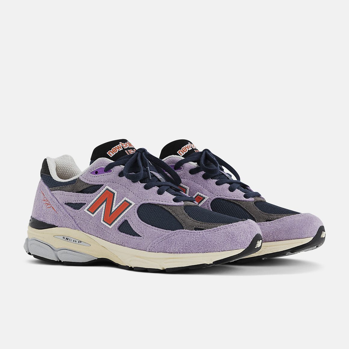 La New Balance 990V3 Made in USA est un modèle sorti en 2012, à l’occasion des trente ans de la mythique ligne 990. Véritable concentré de technologies et de matériaux de qualité, la New Balance Made in USA 990v3 Raw Amethyst by Teddy Santis se pare de tons parfaits pour les beaux jours actuels. La tige est construite sur une base de mesh marine, visible sur la toebox et sur le reste de l’empeigne par touches. Du cuir suédé lavande, légèrement pelucheux, vient renforcer l’ensemble de la tige et souffle un vent de fraîcheur sur cette itération. Des oeillets violets contrastent avec le lavande et des touches rouges habillent le logo latéral, ainsi que l’inscription 990 sur le quart arrière. Les lacets marine reposent sur une languette en mesh dont le sommet en suède noir est embossé d’une inscription New Balance USA en rouge. Ce même ton se retrouve sur le heeltab, qui porte un logo NB, et qui est surmonté d’un empiècement en cuir suédé noir, portant la mention d’origine de la paire. Cette dernière repose sur une semelle intermédiaire ENCAP crème, dont la partie inférieure arrière est grise. Une semelle extérieure majoritairement noire vient finaliser ce design de Teddy Santis.