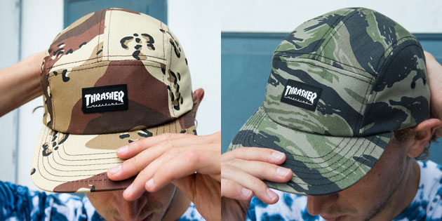 Voici les deux nouveaux coloris de casquettes 5 panel que le magazine de skate américain Thrasher vient de sortir. Ces casquettes sont disponibles en version Desert Camo ou Tiger Camo.