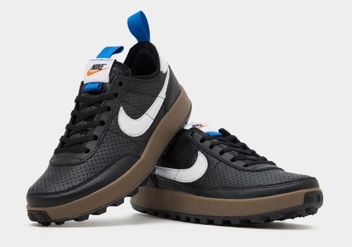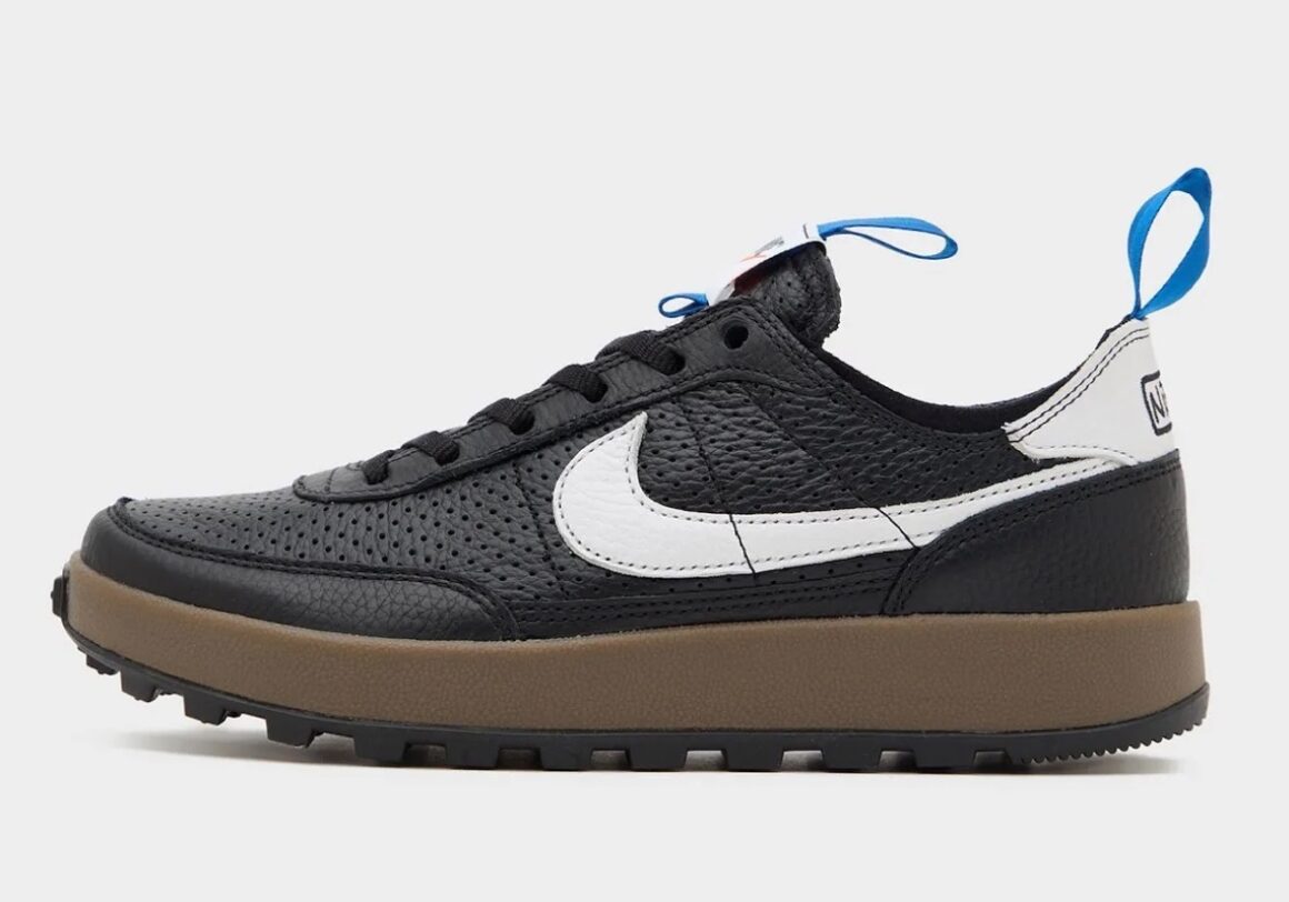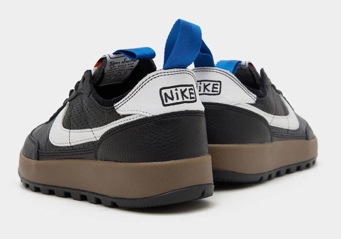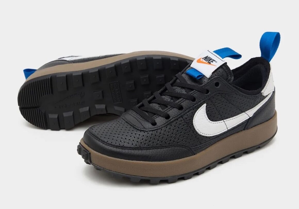 L’évolution la plus notable de cette Tom Sachs x Nike General Purpose Black White réside dans son choix de matériaux. Là où les versions précédentes privilégiaient un mélange de mesh et de textiles techniques, cette déclinaison adopte une tige entièrement en cuir perforé noir, apportant une structure plus rigide et une sensation premium. Cette transformation confère à la silhouette une présence plus affirmée et une durabilité accrue. Les perforations stratégiquement réparties assurent une ventilation efficace tout en créant un jeu de textures subtil. Cette combinaison de robustesse et de respirabilité renforce la dimension utilitaire du modèle. Visuellement, la paire repose sur une palette volontairement minimaliste. La base noire profonde domine l’ensemble, tandis que des accents blancs viennent souligner les éléments clés du design. Le Swoosh latéral et l’empiècement du talon adoptent cette teinte claire, créant un contraste net qui structure visuellement la silhouette. De discrets détails colorés viennent compléter l’ensemble : des tirettes bleues apportent une touche subtile de dynamisme, sans perturber l’équilibre monochrome. Cette palette simple renforce l’identité volontairement fonctionnelle de la sneaker, qui privilégie la lisibilité et la cohérence plutôt que l’effet spectaculaire. Sous le pied, la General Purpose Shoe conserve une configuration emblématique. Une semelle intermédiaire en mousse EVA sombre assure un amorti confortable, tandis que la semelle extérieure reprend un motif inspiré de la traditionnelle traction waffle de Nike.