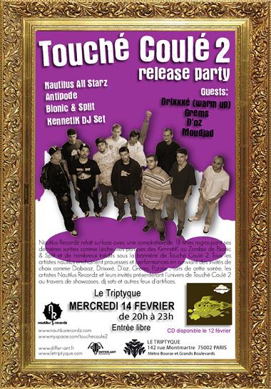 A l’occasion de la sortie de la compilation Touché Coulé 2 venez passer un bon moment au Triptyque mercredi 14 février à partir de 20h. Nautilus Recordz label d’Orléans sort de l’underground après les remarqués maxis « Lèche mes Pompes » et « Zombie ». Venez tôt pour voir et écouter Drixxxé en warm up ainsi que Antipode, Bionic & Split, KennetiK, D’oz,Moudjad, Grems… Entrée libre, Mercredi 14 février.