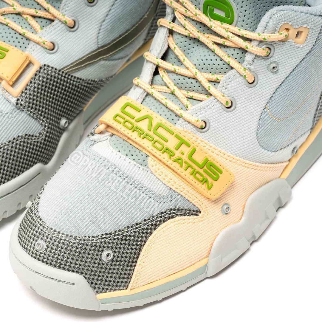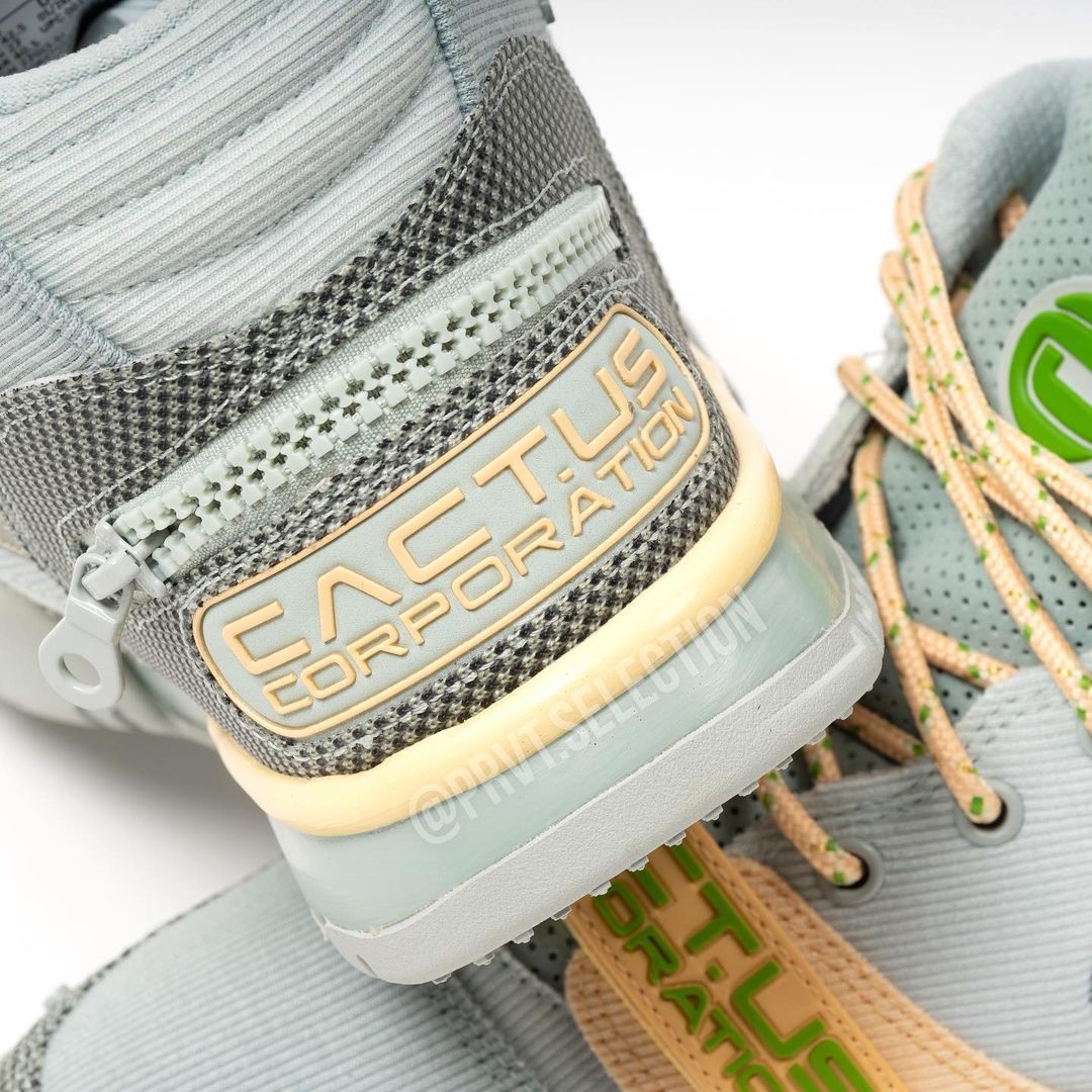 Baptisé Light Smoke Grey, ce coloris s’inspire de la version originale Chlorophyll de la Nike Air Trainer 1. Entre les mains de La Flame, son empeigne se pare d’un camaïeu de gris en velours côtelé. La toebox et les passages de lacets sont clairs et contrastent avec le gris du panneau latéral. Ce dernier est traversé par un Swoosh dont seules les coutures beige restent apparentes. Les gardes-boues en canvas grainé sont gris foncé et l’arrière est estampillé d’un cartouche Cactus Corporation, en référence au label de Travis Scott. Cette inscription se retrouve en vert chlorophylle sur le strap mythique à la base de la languette. Embelli par un effet vintage jauni, il illumine la paire aux tons neutres. On retrouve cette combinaison de couleurs sur les lacets ronds et le vert chlorophylle teint également le logo Cactus Corporation de la languette en cuir perforé. La paire repose sur une semelle gris clair, liserée par une ligne beige. L’ensemble de la tige est traversé par des boutons-poussoirs, permettant de couvrir la sneaker d’un tissu en Ripstop pour la protéger contre tout accident. Son côté intérieur est truffé d’illustrations, faisant office d’instructions.