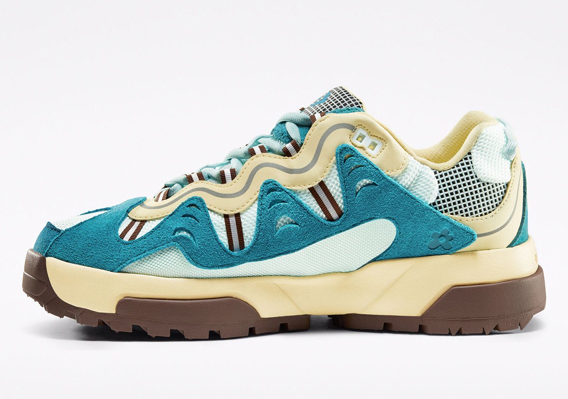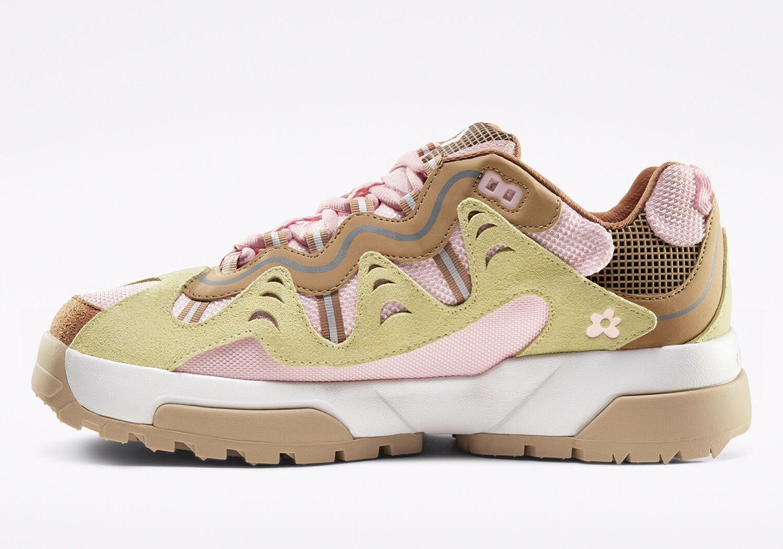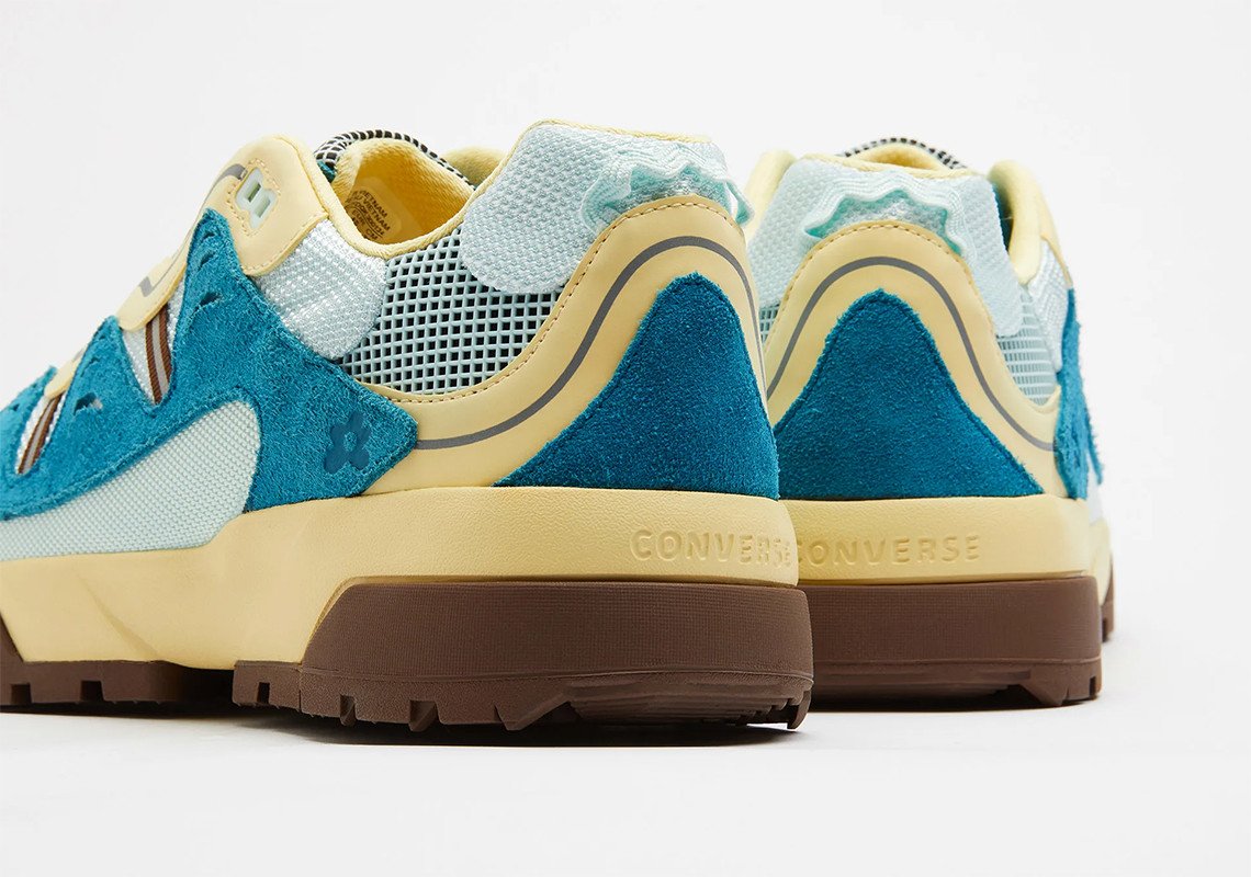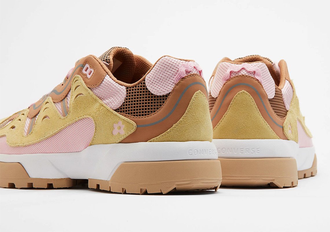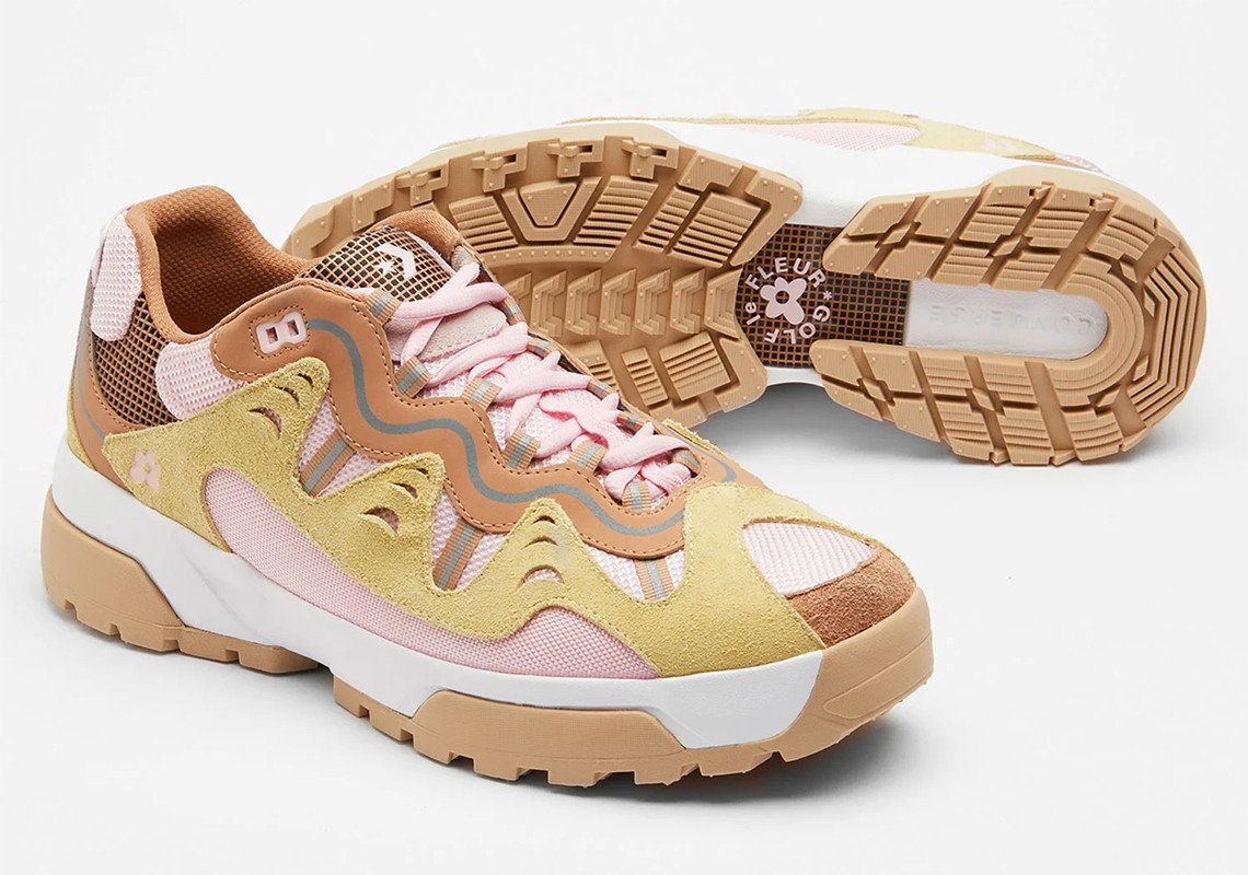 Les teintes proposées pour ce duo de Converse inédit sont de saison avec un bleu et un rose pastel propres à l’identité de l’artiste. Chaque teinte est combinée avec des éléments blanc, marron ou beige pour un rendu vibrant, agrémenté également par une teinte jaune ou marron pour la doublure. Chaque modèle repose sur une semelle bicolore blanche et beige ou marron et beige selon le coloris. Dérivée de l’univers de la randonnée, elle est compensée et nervurée sur sa partie extérieure pour une meilleure adhérence. L’ADN Golf, le Fleur est transcrit par l’utilisation du logo floral disposé à plusieurs endroits de manière discrète comme sur la languette. Saison printanière oblige, les matériaux évoluent à leur tour pour la construction de ce modèle. Certains empiècements en cuir laissent place à un traitement suédé, tandis que du mesh est utilisé massivement sur la tige. Une pièce de cuir reste présente sur l’empiècement entourant les passants de lacets, arborant notamment des touches de 3M.