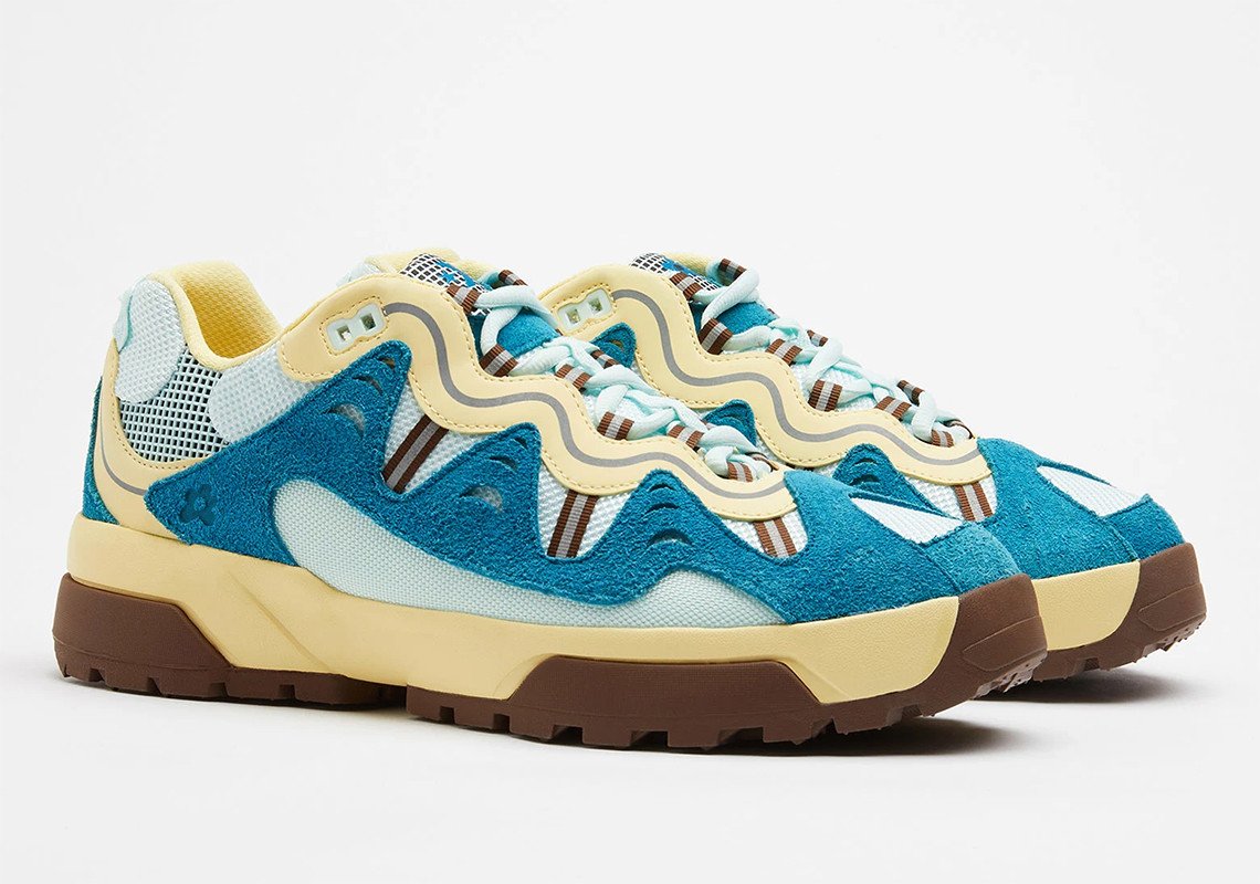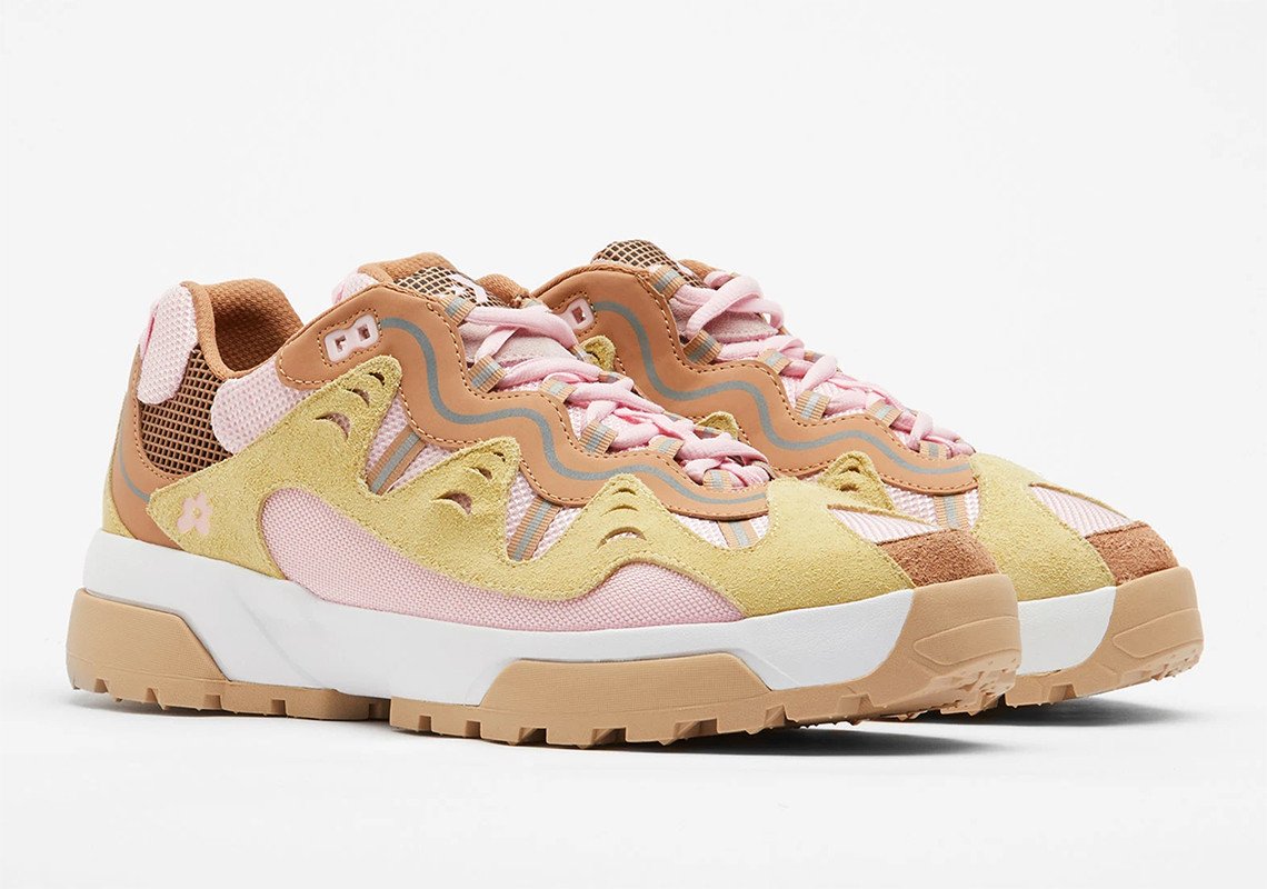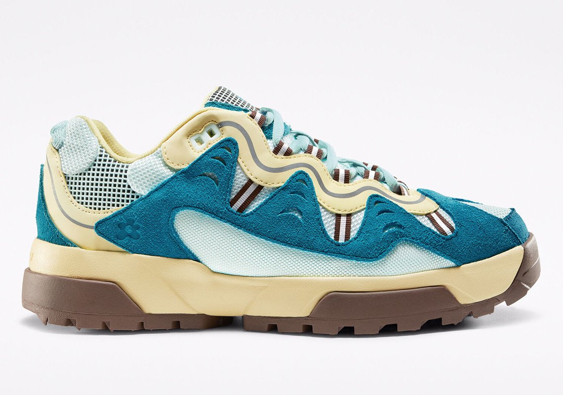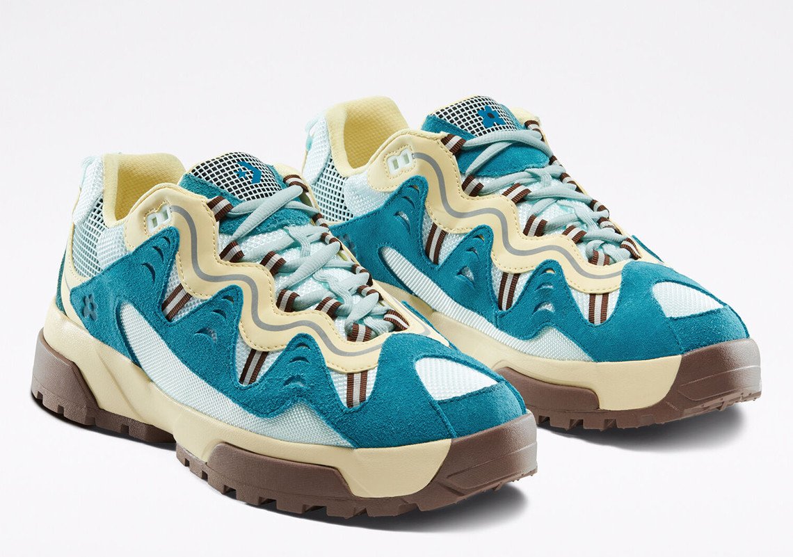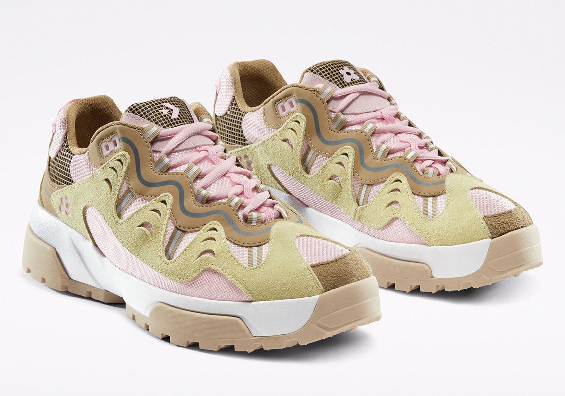 Les teintes proposées pour ce duo de Converse inédit sont de saison avec un bleu et un rose pastel propres à l’identité de l’artiste. Chaque teinte est combinée avec des éléments blanc, marron ou beige pour un rendu vibrant, agrémenté également par une teinte jaune ou marron pour la doublure. Chaque modèle repose sur une semelle bicolore blanche et beige ou marron et beige selon le coloris. Dérivée de l’univers de la randonnée, elle est compensée et nervurée sur sa partie extérieure pour une meilleure adhérence. L’ADN Golf, le Fleur est transcrit par l’utilisation du logo floral disposé à plusieurs endroits de manière discrète comme sur la languette. Saison printanière oblige, les matériaux évoluent à leur tour pour la construction de ce modèle. Certains empiècements en cuir laissent place à un traitement suédé, tandis que du mesh est utilisé massivement sur la tige. Une pièce de cuir reste présente sur l’empiècement entourant les passants de lacets, arborant notamment des touches de 3M.