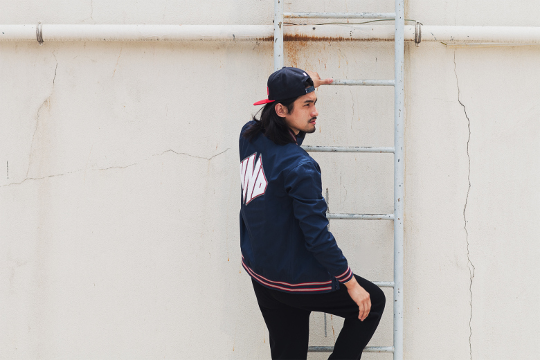 C’est tout d’abord une varsity jacket, ces vestes de sport que l’on retrouve notamment en université, avec les emblématiques bords-côtes qui est proposée. Elle est en toile bleu marine avec quelques touches de rouge. Les initiales de la marque sont présents sur le cœur et le dos. C’est une bouclette blanche qui a été utilisée, typique de ce type de vêtement.