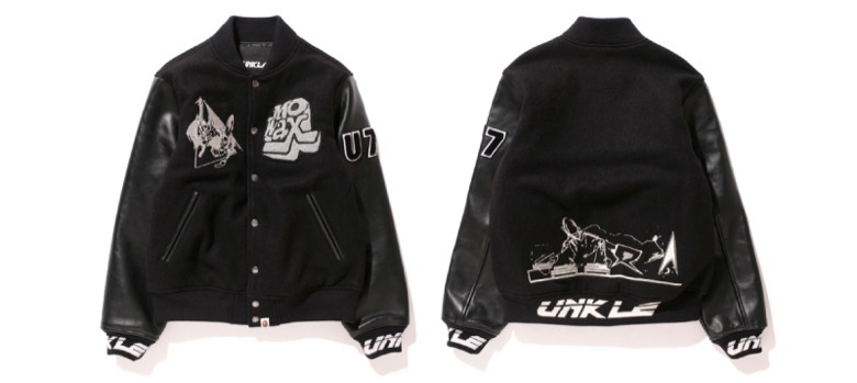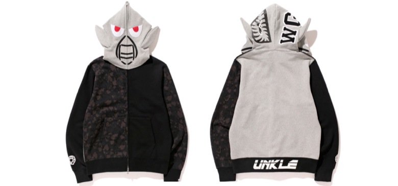 Pour ces fêtes de fin d’année, ce sont donc une varsity jacket, un hoodie (sweatshirt à capuche) et deux tee-shirts qui sont prévus. La veste universitaire doit vous dire quelque chose avec le logo Unkle imprimé sur les bords-côtes. Le hoodie s’inspire du fameux Shark Hoodie de la marque japonaise. La tête de requin est ici remplacé par un élément iconique du label qui avait été imaginé à l’époque par Futura. Ce sont d’ailleurs les designs de ce dernier que l’on retrouve sur les deux tee-shirts.