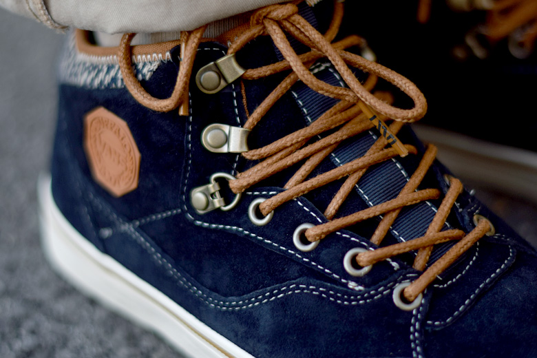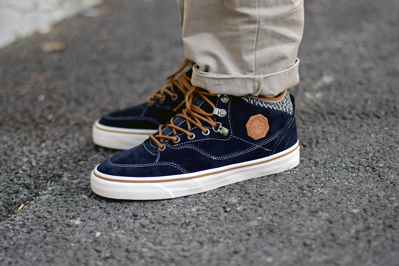 Le modèle, dont le design s’inspire du pro-modèle de Steve Caballero la mythique Vans Half Cab, est de retour pour la saison automne/hiver 2015 de la marque californienne. Deux déclinaisons sont proposées sur le même principe. Nous avons droit à une association de cuir suédé, laine et des touches de marron sur les logos, lacets, intérieurs du chausson et semelles extérieures. Concernant les coloris, il y a un gris clair et un bleu marine. Le modèle regorge de détails intéressants : passants de lacets façon boots de randonnée, finitions du chausson et de la languette avec une couture originale, la touche de laine, le logo spécial sur le côté, les surpiqûres blanches, l’impression du logo 66 sur les bouts de lacets…