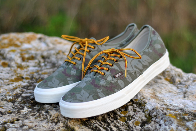 Les premières paires de sneakers de la collection printemps 2013 chez Vans California commencent à arriver. La marque propose un pack de deux modèles avec cette toile « Floral Camo » dont une Vans Authentic California. La semelle est vierge de tout marquage et la Vans Authentic est livrée avec une paire de lacets « workboots ».