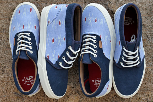 Vans lance un pack de deux paires de sneakers pour sa collection Holiday 2013. Un imprimé ikat (d’origine indienne « navajo ») a été appliqué sur une toile en chambray bleu clair. Un daim bleu marine a été ajouté pour créer un léger contraste. Ce combo de couleurs et de matériaux a a été mise en place sur deux modèles, Vans Era et Vans Chukka.