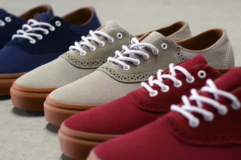 Pour la saison à venir, automne/hiver 2015, le modèle sera proposé chez Vans California. Plusieurs versions sont prévues et le modèle a d’ailleurs été retravaillé dans un style « Decon » (pour Deconstruct, il n’y plus de renforts à l’intérieur, le rendu est bien plus sobre). On a d’ailleurs l’habitude de voir du Decon chez Vans California et plus précisément sur le modèle Authentic. La Vans Spectator partage d’ailleurs la même silhouette que cette dernière mais avec quelques détails plus sophistiqués. Le principal ajout réside dans cet empiècement central en cuir suédé qui arbore des perforations façon chaussures brogue. Trois coloris sortiront cet été : bleu marine (dress blues), gris clair (aluminium) et bordeaux (biking red). Chaque paire est finie avec une semelle entièrement gomme. Les lacets sont ronds et blancs pour aller avec les œillets. Le rendu est plutôt élégant.