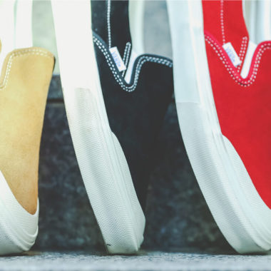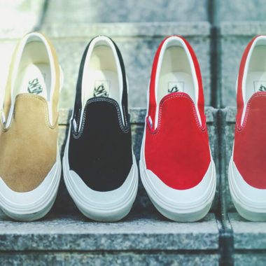 Cette fois-ci, c’est le même principe qui est appliqué à la Vans Slip-On. Le modèle est légèrement plus affiné et on retrouve donc cette partie en plus qui fait la jointure avec la semelle extérieure. Le rendu est très original. Le reste de la paire est sobre avec une empeigne en cuir suédé déclinée dans trois versions : noir, beige et rouge.
