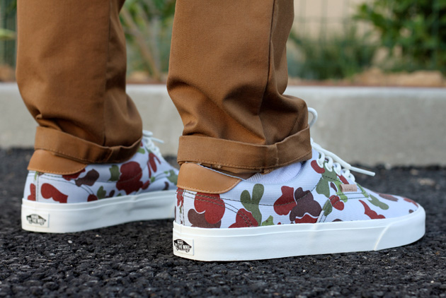 Vans décline sa Vans Era 59 pour sa collection California avec un motif inédit. Ce « Camo Suiting » est un mix de camouflage appliqué sur de fines rayures bleues (surement la raison de l’utilisation du terme « suiting ») que l’on distingue à peine. Un empiècement en cuir marron a été placé au talon et des lacets ronds blancs accompagnent la paire.