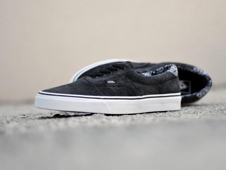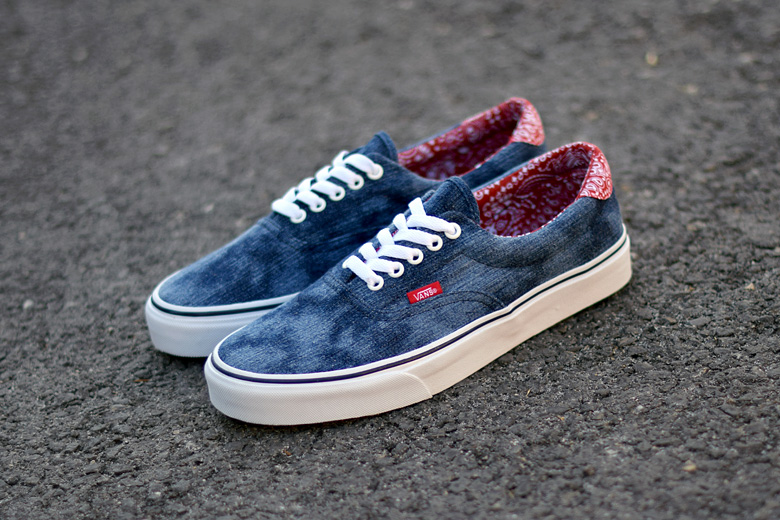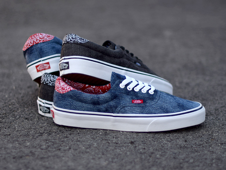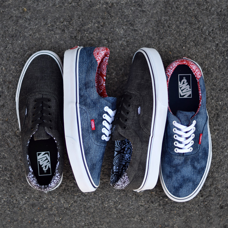 Pour cette saison automne/hiver 2015, ce sont deux paires de sneakers qui sont déclinées de la sorte avec des toiles de denim différentes, bleu ou noir. Le jean est d’ailleurs légèrement délavé, « Acid denim » comme aime l’appeler la marque américaine. Enfin, c’est un motif bandana que l’on retrouve à chaque fois au niveau du talon. La Vans Era en toile denim bleue et bandana rouge rappellera peut-être à certains un modèle déjà sorti par la marque Supreme.